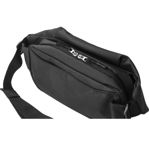 Cross shoulder/waist bag, water repellent with adjustable strap and three zipped pockets.