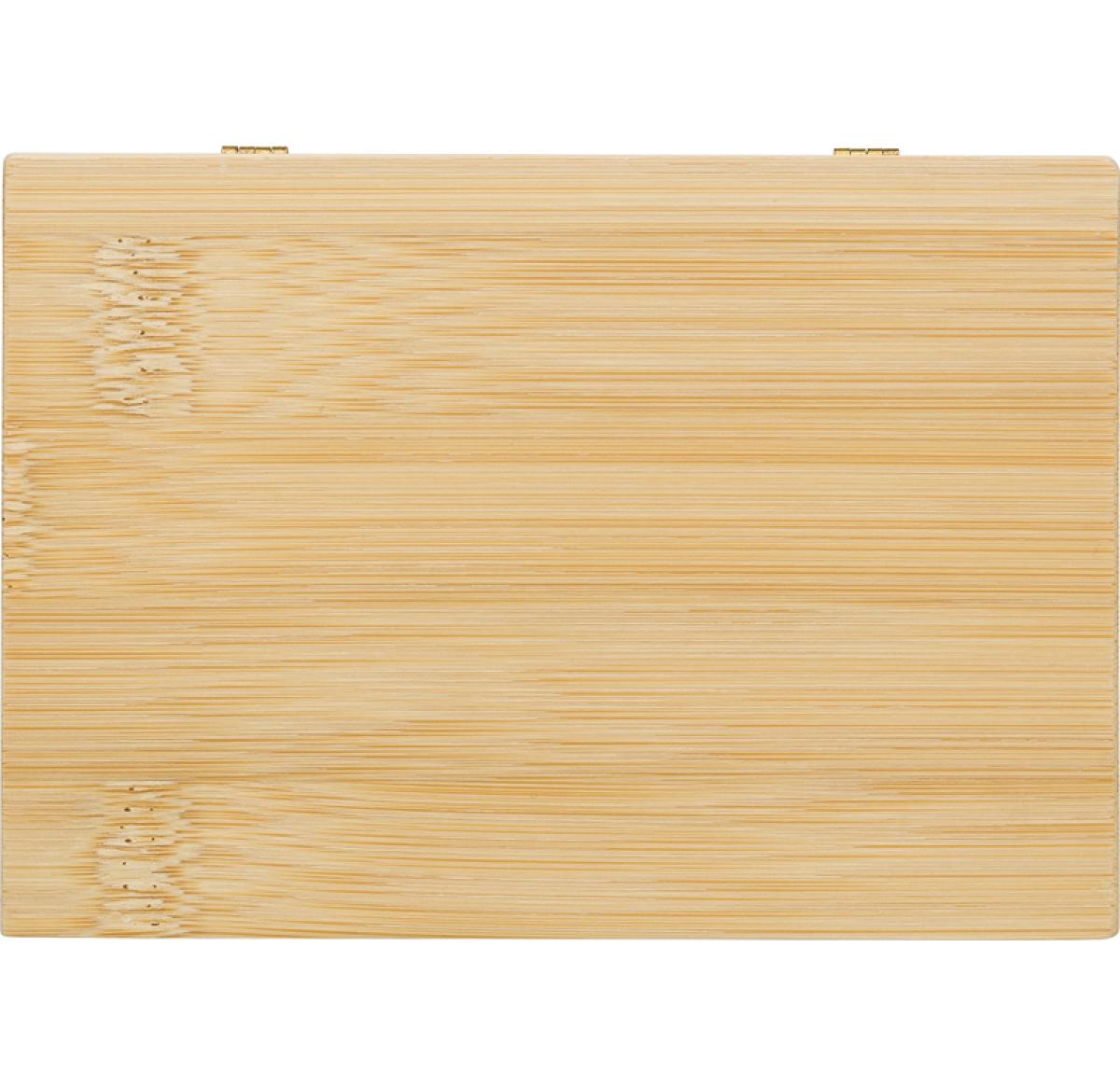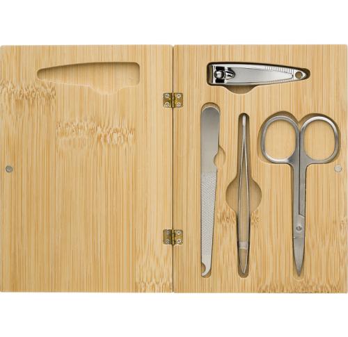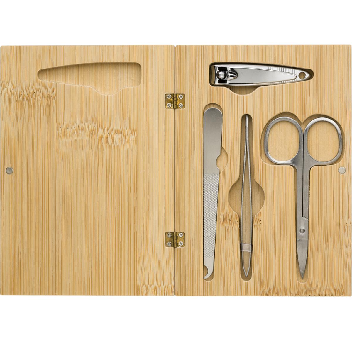 Bamboo manicure set with scissors, nail clippers, tweezers and a file. Individually packaged in a brown cardboard box.