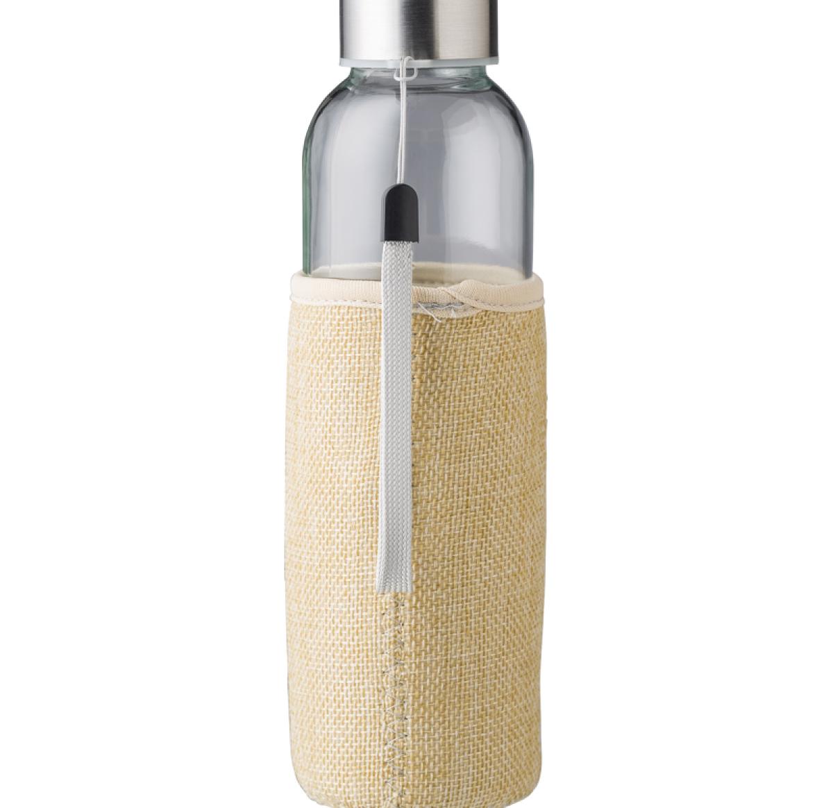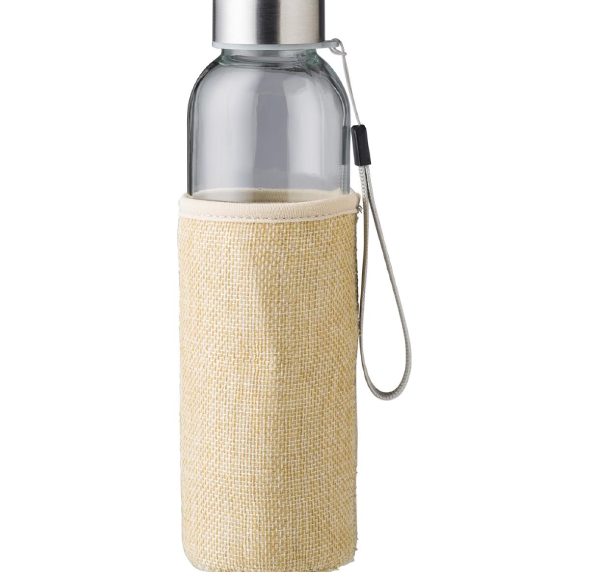 Glass 500ml drinking bottle with bamboo inlaid lid, wristband and jute pouch. Individually packaged in a brown cardboard box.