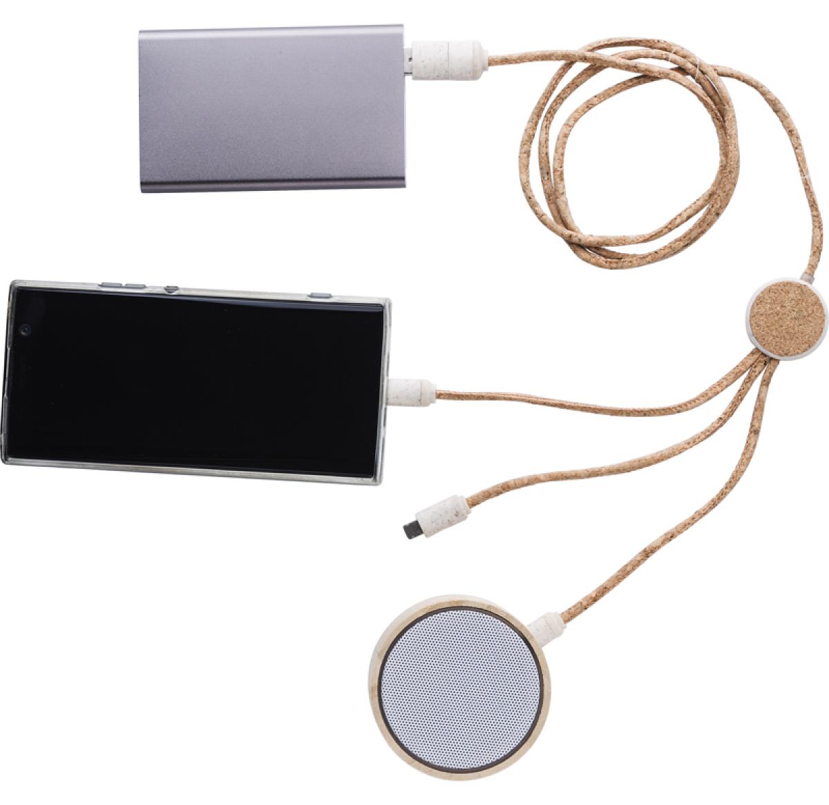 Stainless steel charging cable (120 cm). USB-A/USB-C to lightning and micro-USB. The cable is cork and the sockets are made of wheat straw. Individually packaged in a kraft paper box.