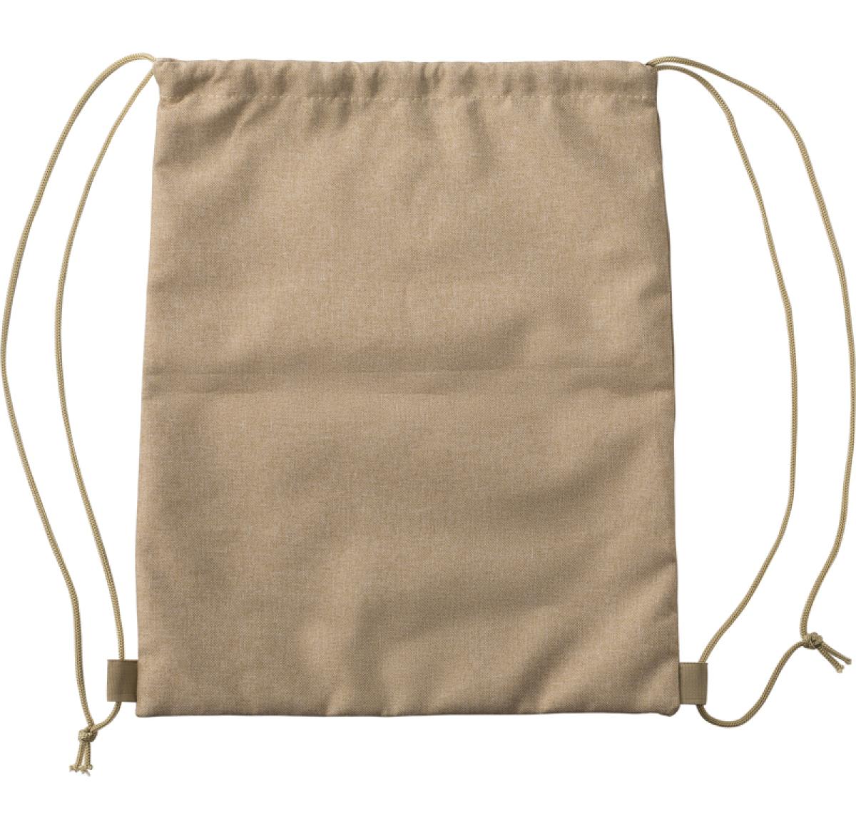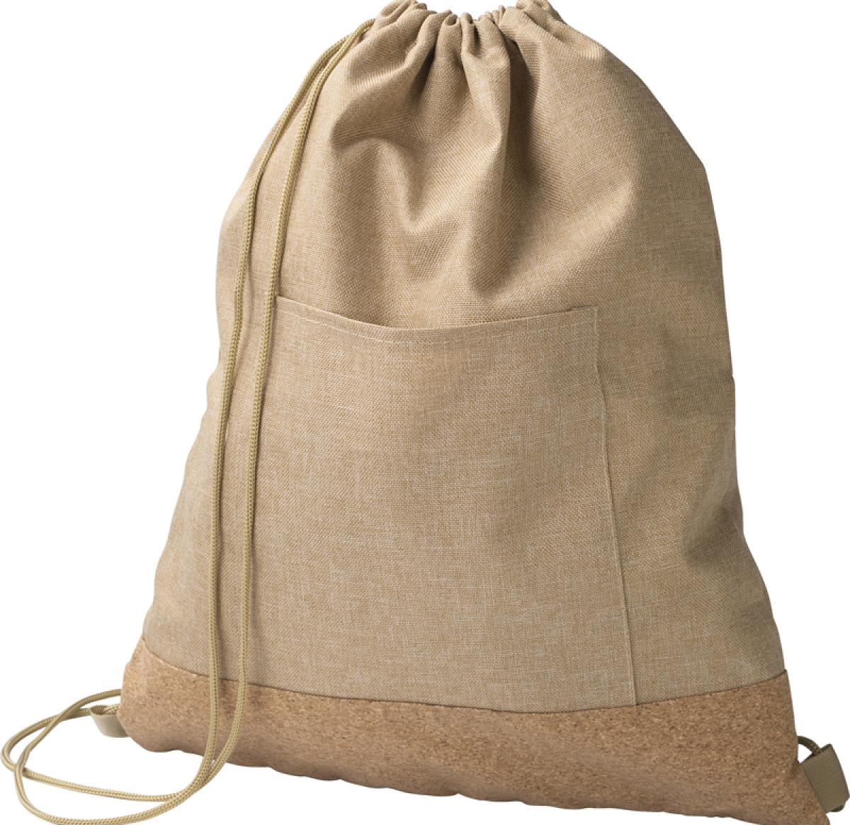 Natural coloured 600D RPET polyester drawstring bag with a cork base and a front pocket.