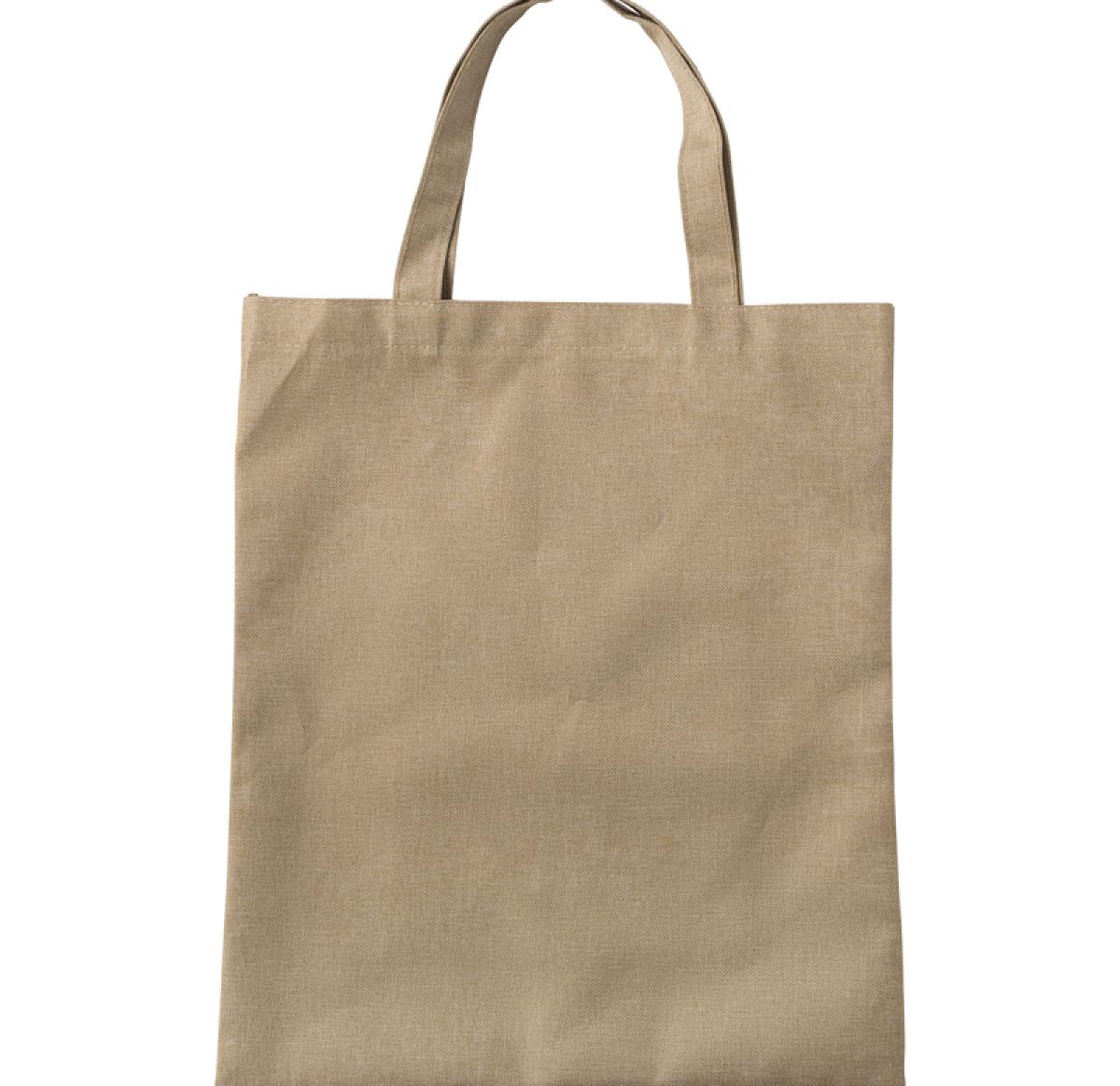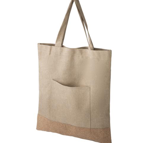 Natural coloured 600D RPET polyester shopping bag with a cork base, front pocket and short handles.