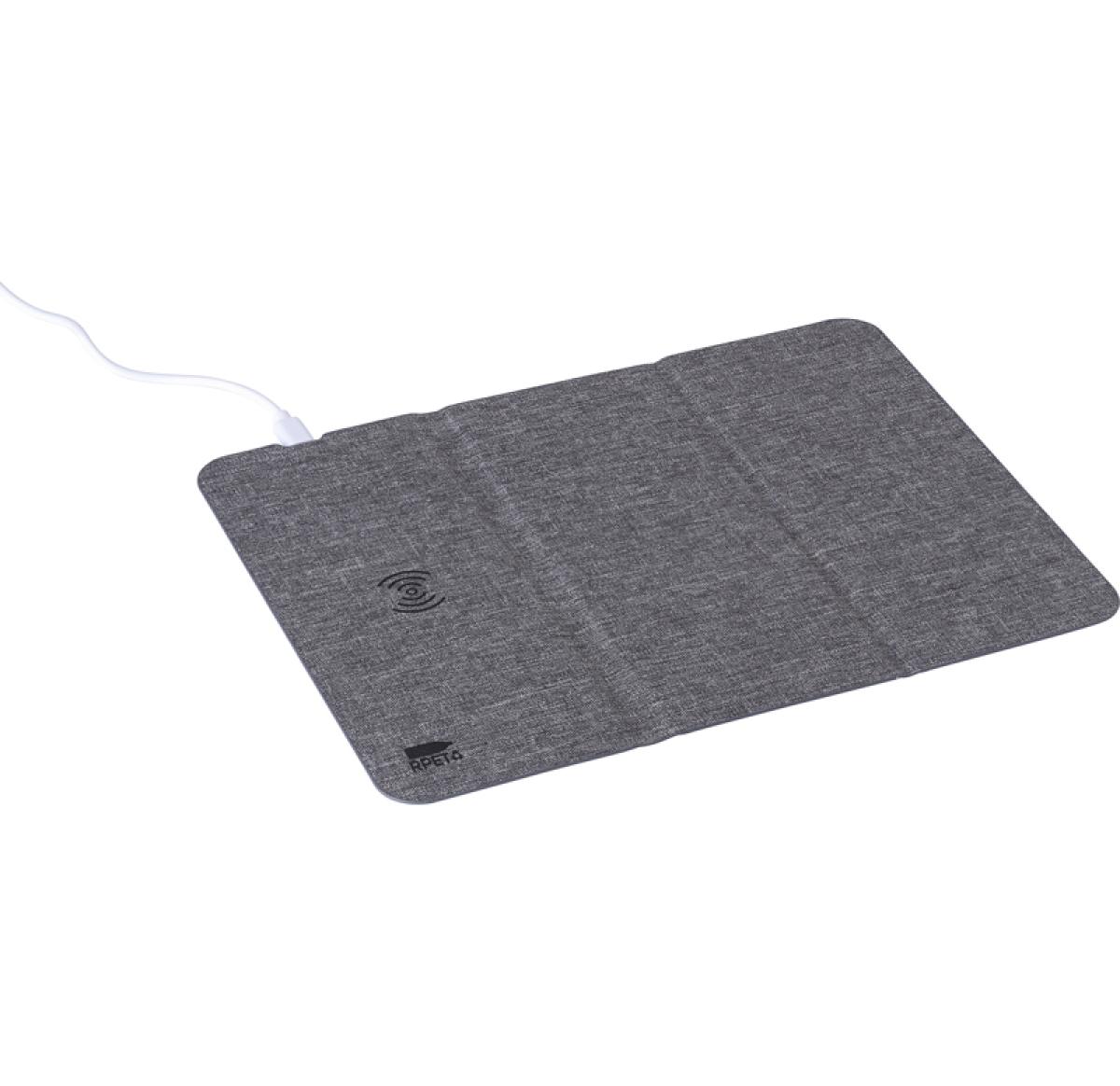 RPET Wireless fast charger mouse mat (10W). Can be folded to be used as phone stand. RPET logo printed on mouse mat as standard. Packed in a brown carton.