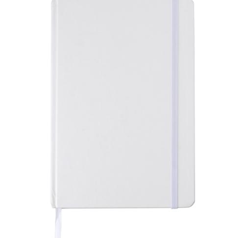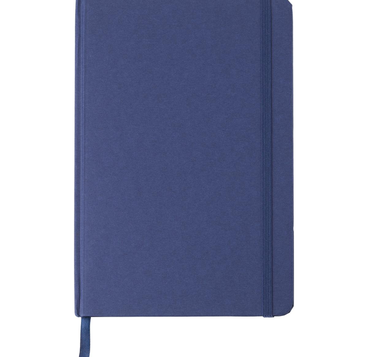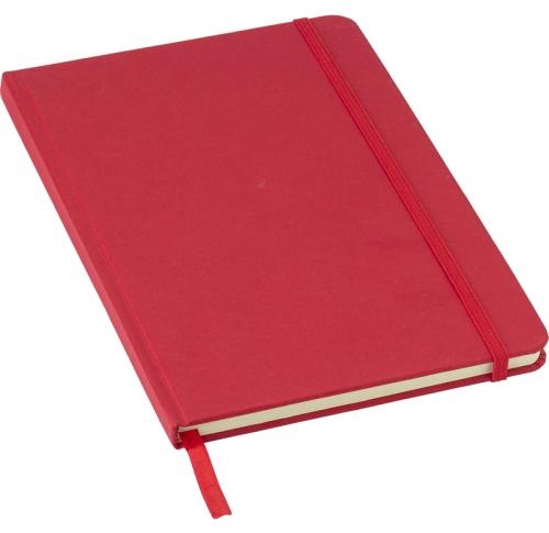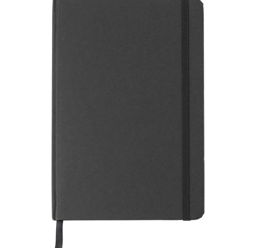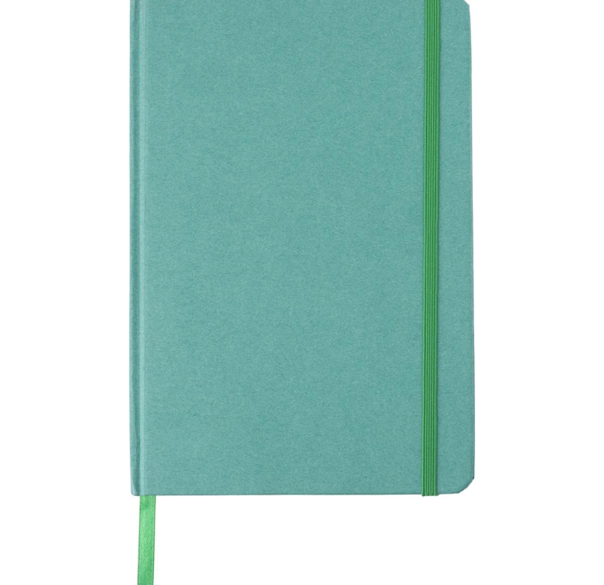 Notebook (A5) with a recycled cardboard cover, 160 lined pages, elastic band to keep closed and a ribbon bookmark.