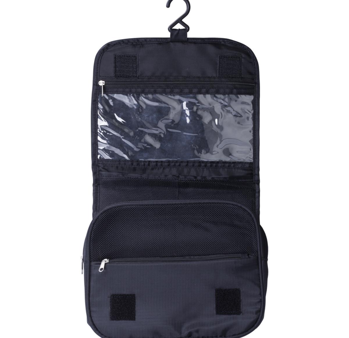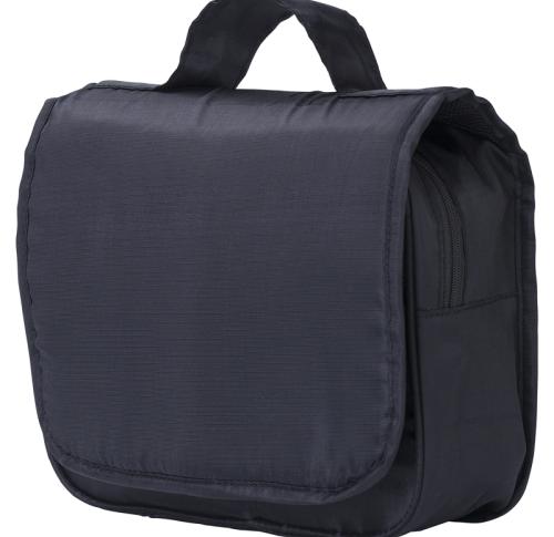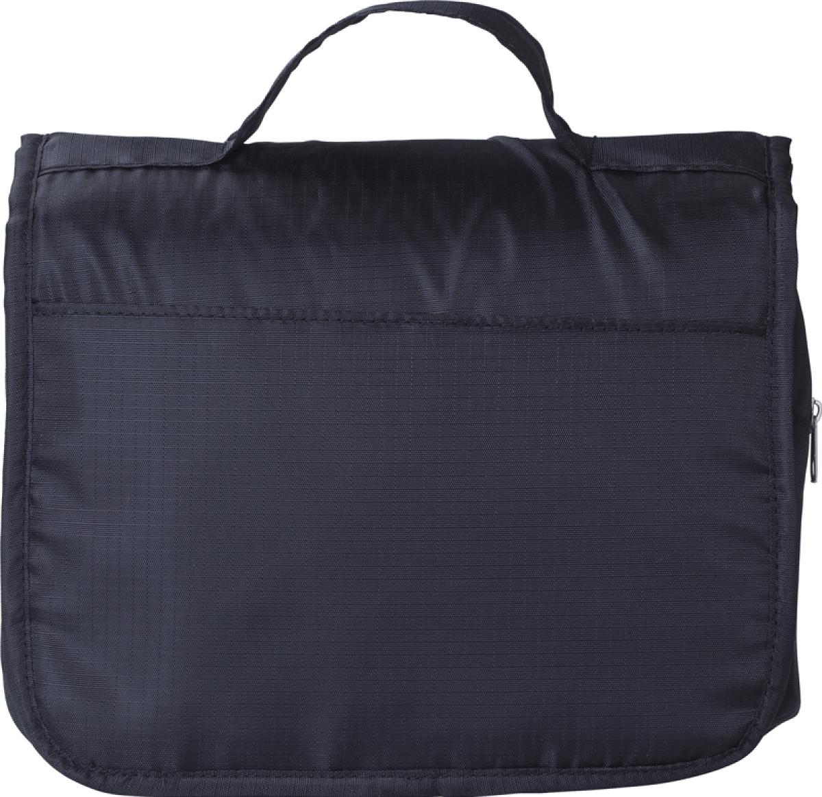 Polyester toiletry bag with hanging hook. Made from a ripstop material.