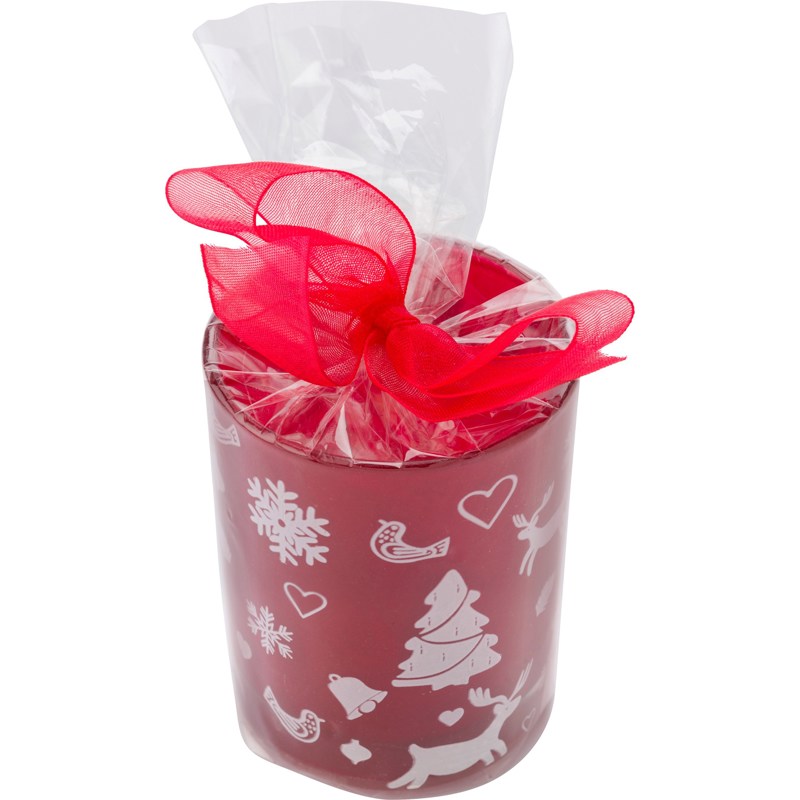 Decorated glass candle holder with tea light, wrapped in transparent foil with a red ribbon closing.