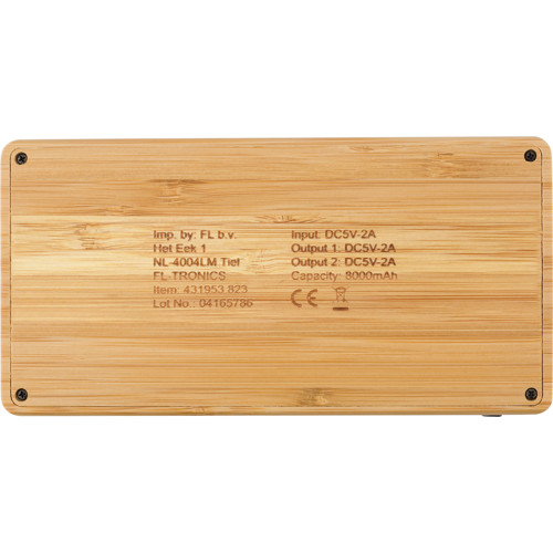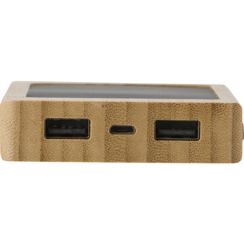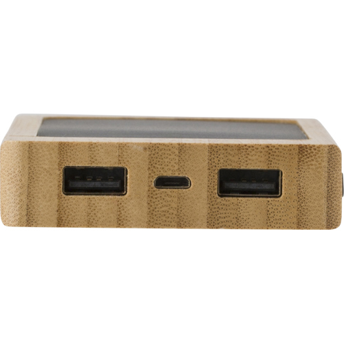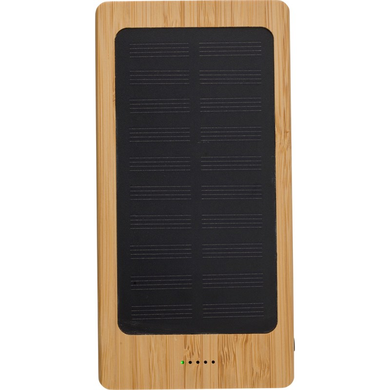 Bamboo solar power bank with a capacity of 8.000 mAh, two USB ports, one micro USB port and four LED indicators. Input: DC 5V/2A, output: DC 5V/2A. Including cable.