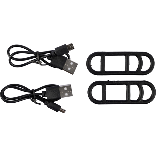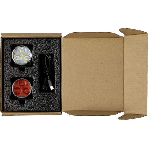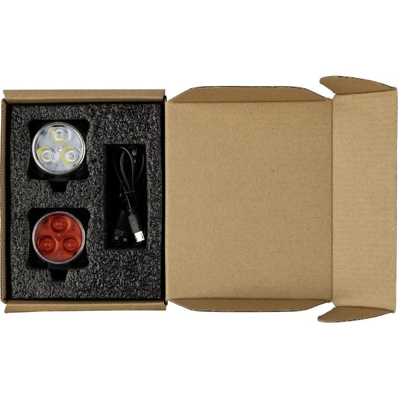Rechargeable set of two bicycle lights featuring 3 LED lights with 4 lighting modes. Individually packaged in a brown carton box.