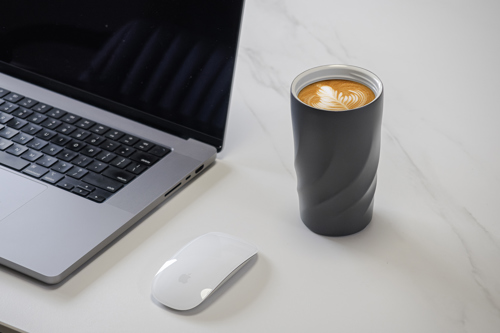 The sustainable travel mug is crafted from recycled stainless steel with a ceramic coating, blending eco-luxury and functionality. Its ceramic interior ensures the purest flavours for your coffee and tea, while being odourless, durable, and easy to clean. The 400ml tumbler offers both quality and environmental stewardship. The screw-on, leak-proof lid accommodates frothy beverages and features a carrier loop for added convenience. This allows the attachment of a crossbody carrying belt for a hands-free experience, making it a perfect companion for eco-conscious individuals.. Dishwasher safe 4 hours hot/warm - 12 hours chilled - 18 hours iced