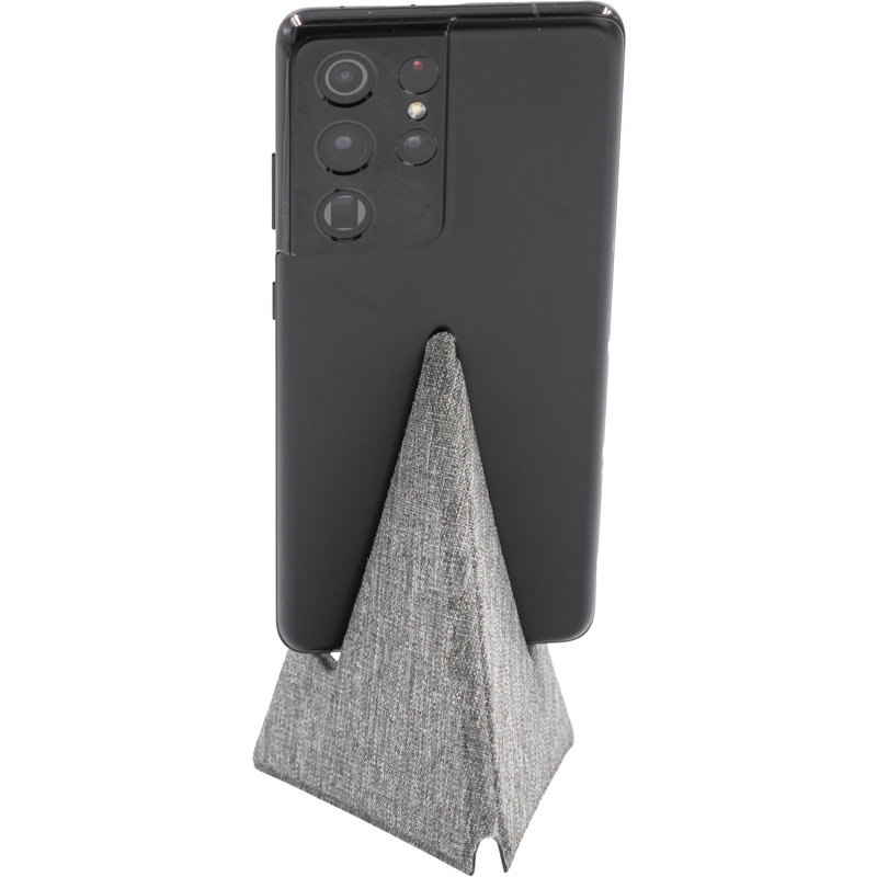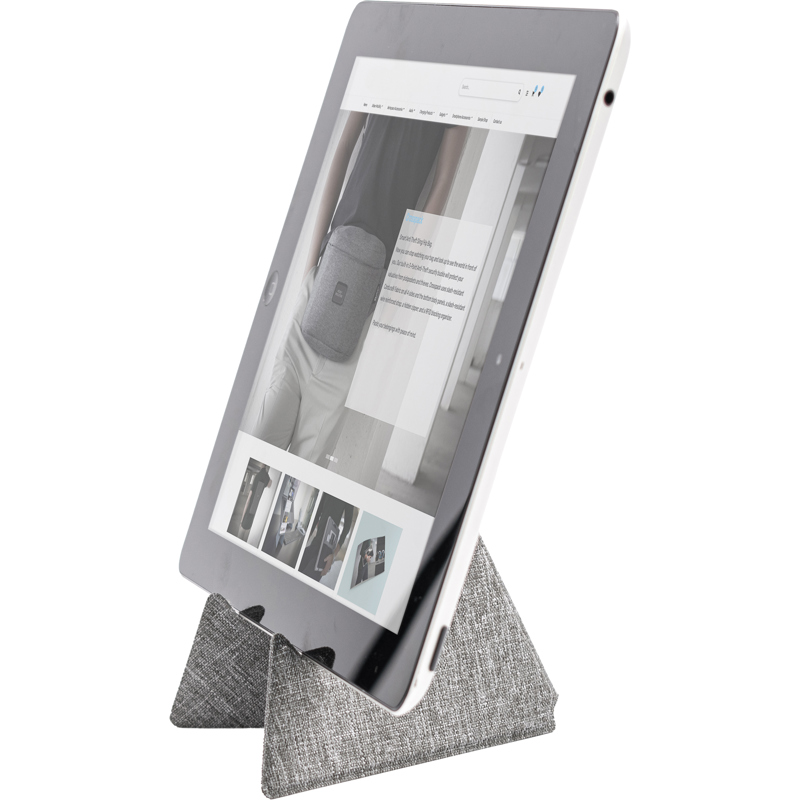 The phone and tablet stand, made from RPET, features a magnetic fold closure for easy portability. It holds smartphones and tablets up to 13 inches and includes a cable organiser to keep workspaces neat.. Made from 0.2 recycled PET bottles