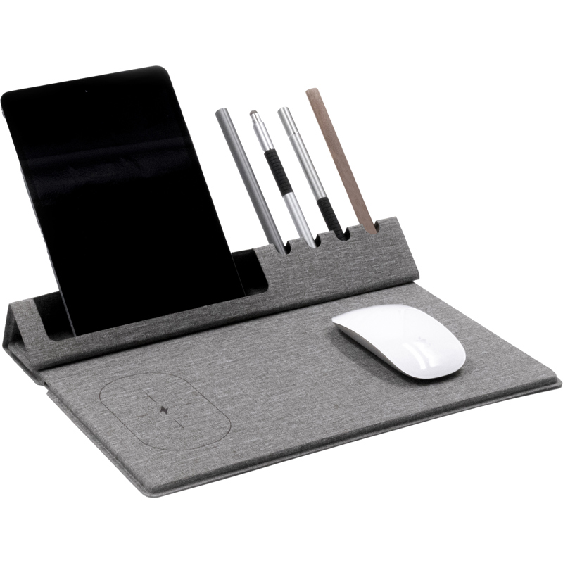 Transform your workspace with desk pad. Made from recycled PET bottles, this multifunctional tool combines a wireless charger, mouse pad, phone holder, and pen holder in one compact design. Whether you're at the office, home, or a coffee shop, Evopad keeps your workspace organised, tidy, and fully charged wherever you go.. Made from 0.6 recycled PET bottles