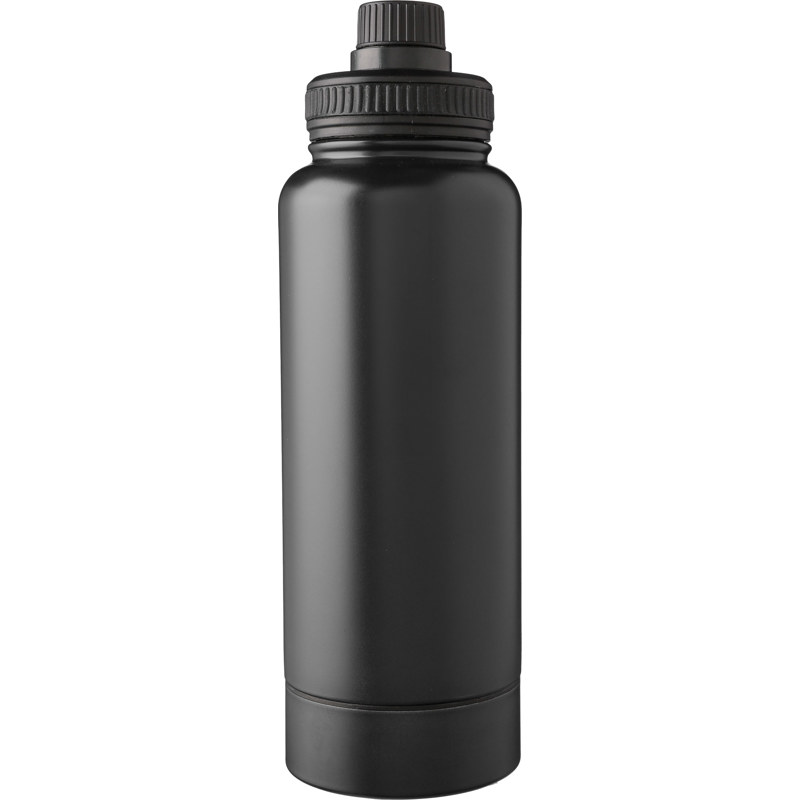 Stainless steel double walled drinking bottle. Features a PP lid with a screw dispenser and carrying loop. The base includes a small screw-on compartment for storage. Individually packaged in a brown cardboard box.