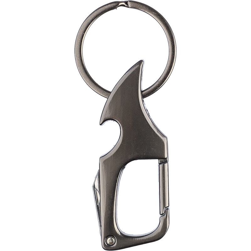 Metal carabiner with a bottle opener and small knife.