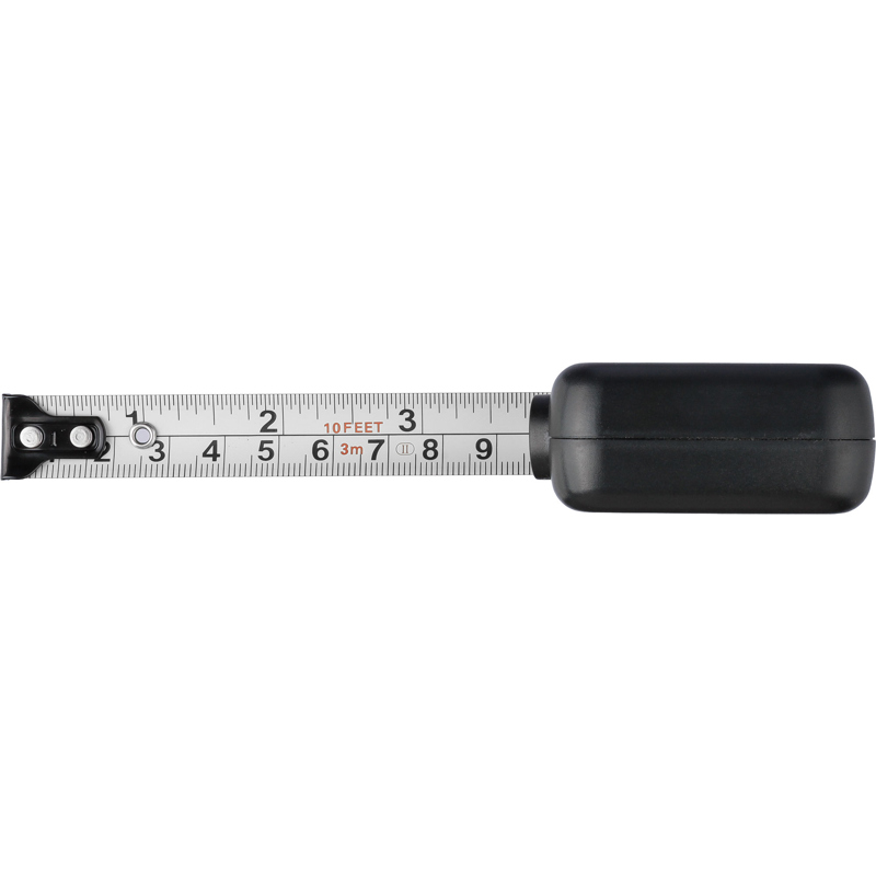Plastic 3m tape measure with both centimetres and inches. Includes push button with lock. Individually packaged in a brown cardboard box.