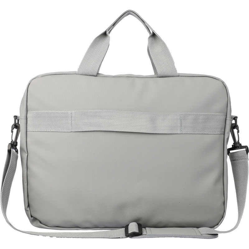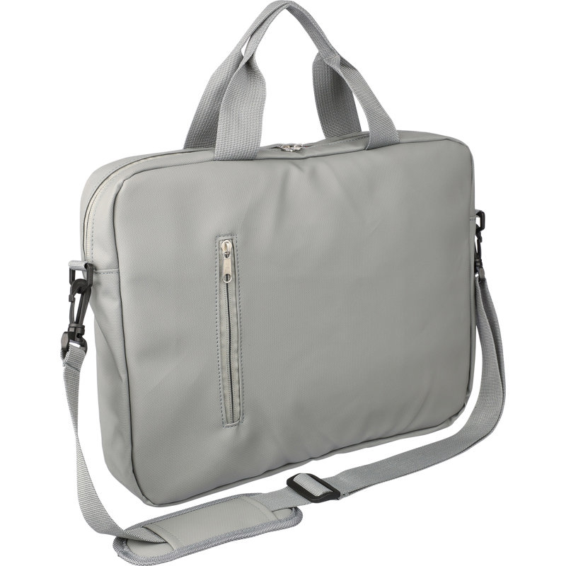 PU laptop bag (15 inch) with two zipped front pockets, a large zipped compartment with a Velcro-closed laptop section and multiple inserts inside. Includes adjustable carrying straps and two handles. Water repellent.