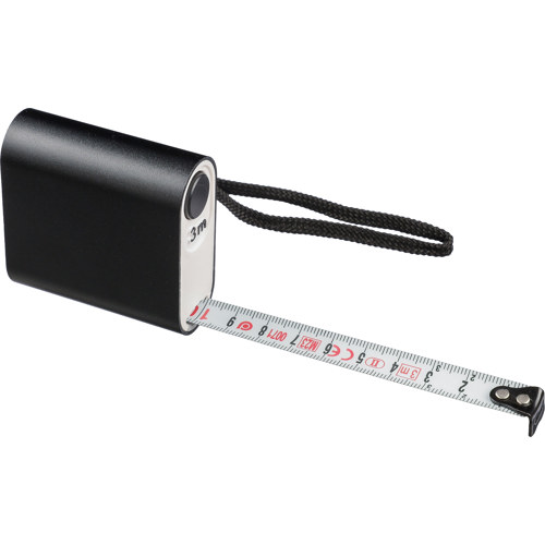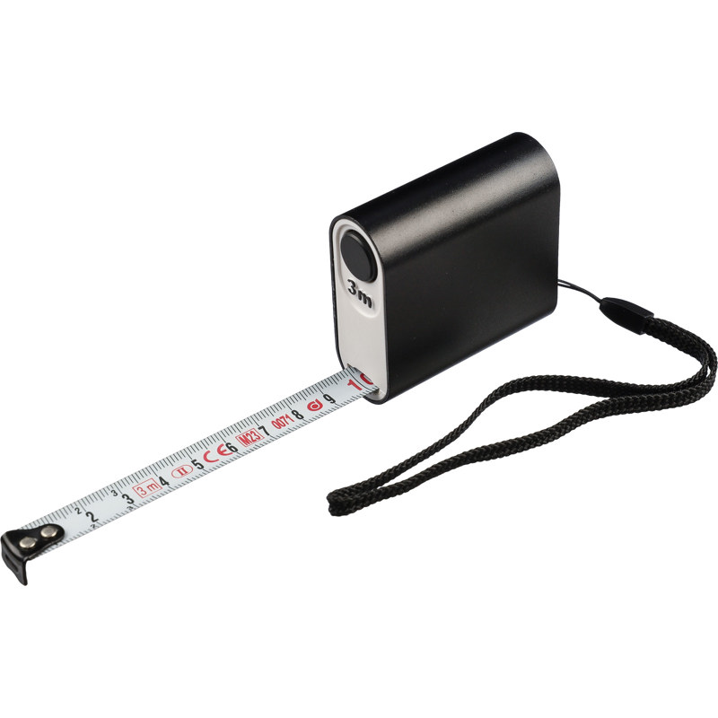 Tape measure with push button and showing centimetres, includes a wrist cord. Individually packaged in a brown cardboard box.