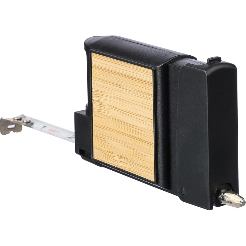 Plastic 3m tape measure with bamboo inlay and spirit level. Includes 5 screwdriver bits. Individually packaged in a brown cardboard box.