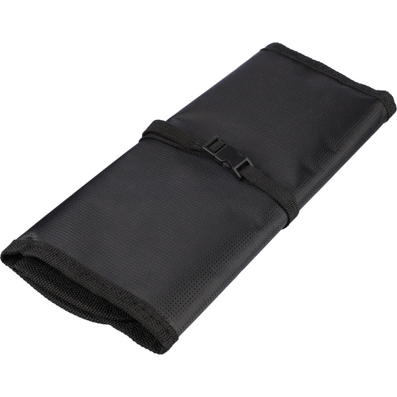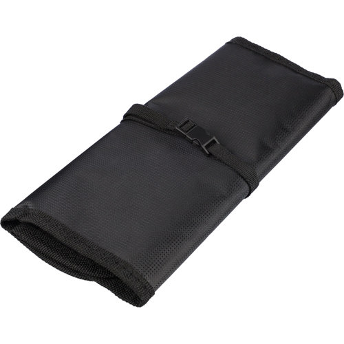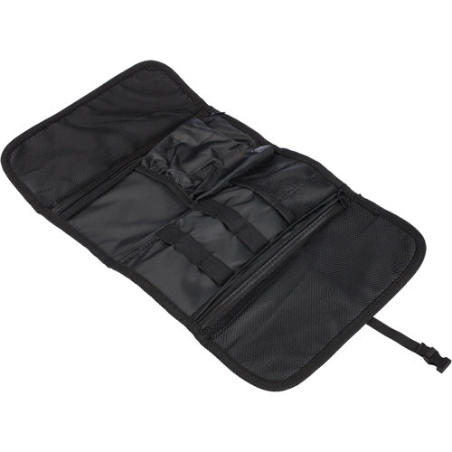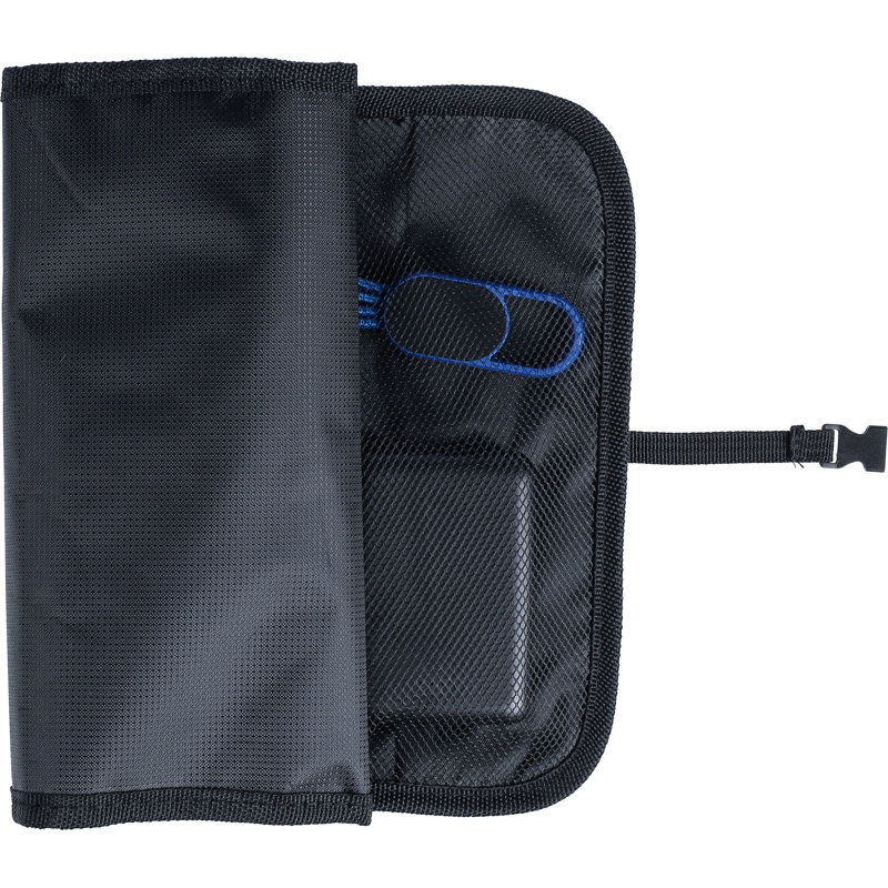 Polyester roll-up bag with multiple pockets and zipped pockets for storing charging cables or devices.