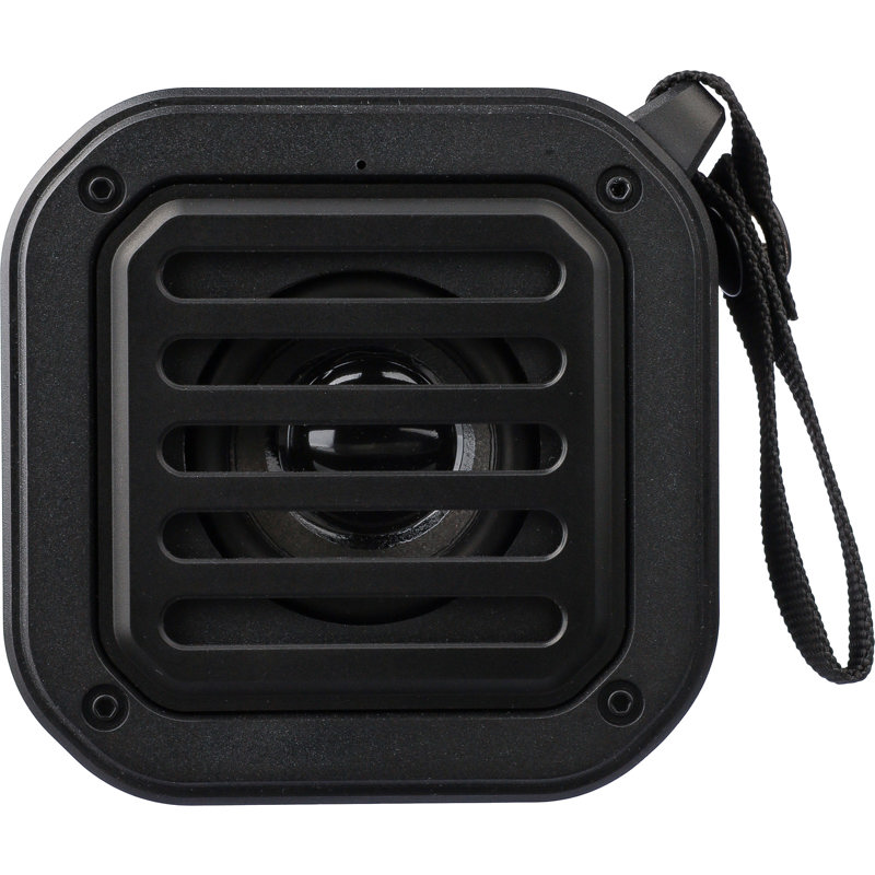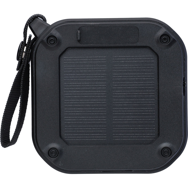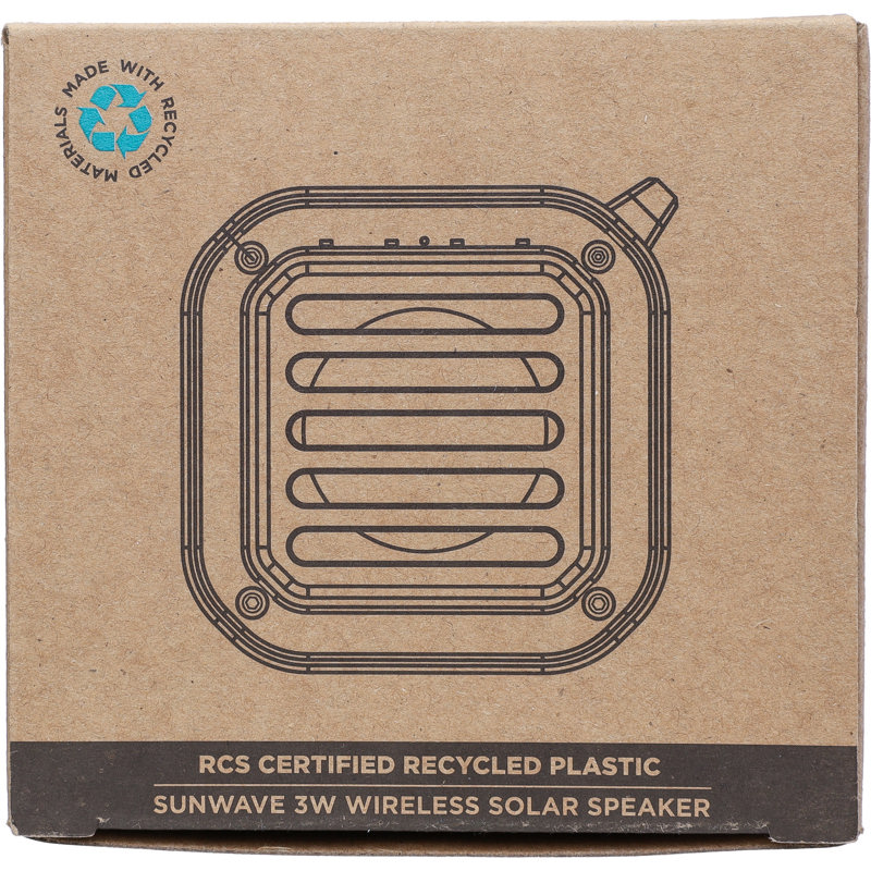 Recycled plastic outdoor speaker with wristband and carabiner. Includes a 400mAh built-in rechargeable battery with 4 hours of playing time. Includes a 30cm Type-C charging cable, built-in LED flashlight (30 lumens), and solar panel to extend usage. Wireless connection technology: 5.3. Individually packaged in a brown cardboard box.