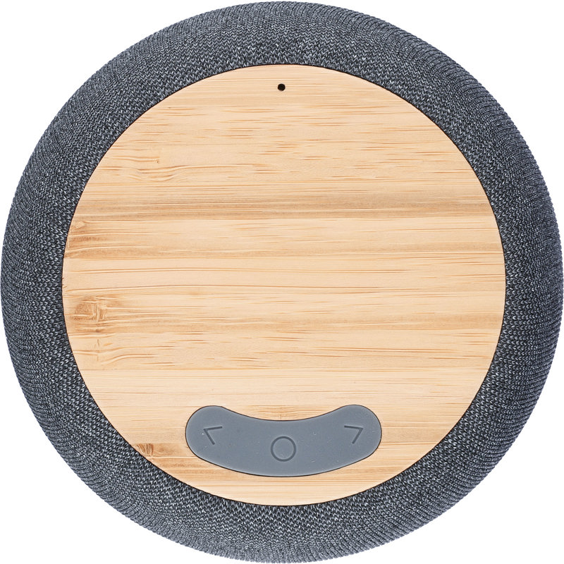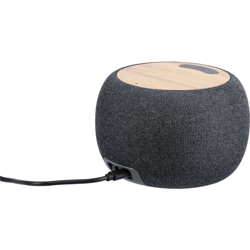 Bamboo and recycled plastic speaker with fabric covering. 5W output, DC 5V input, 1200mAh built-in rechargeable battery with 6 hours of playing time. Working distance of 15-20 metres. Includes a 50cm Type-C charging cable. Wireless connection technology: 5.2. Individually packaged in a brown cardboard box.