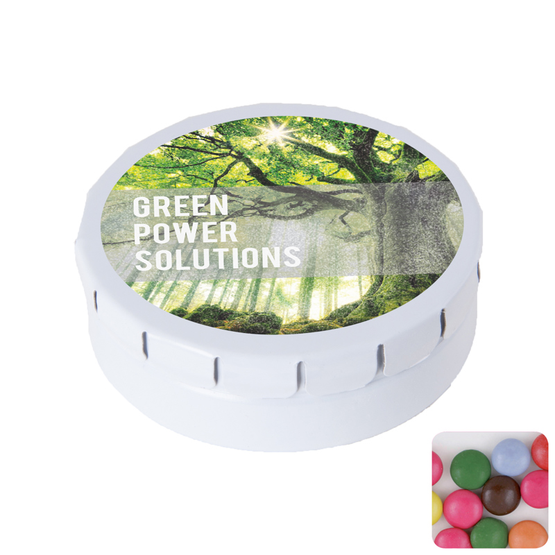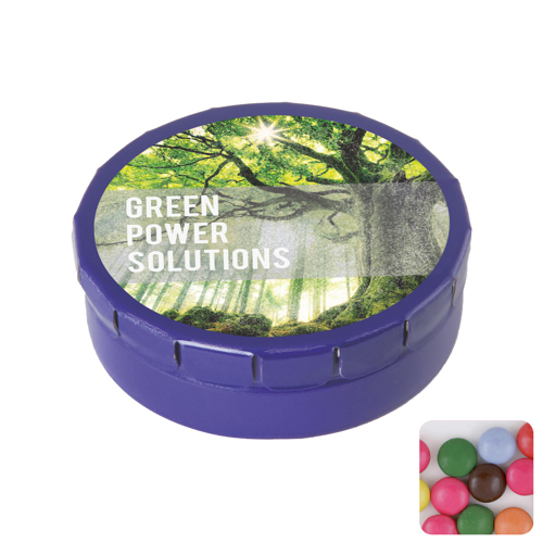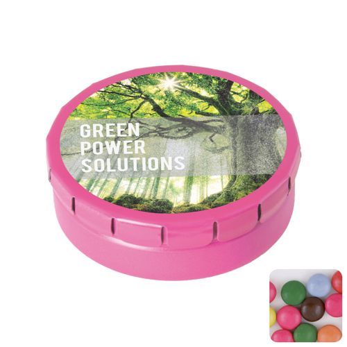 Click tin with milk choco's. Supplied with a mix of chocolate colours.. Approx. 12g