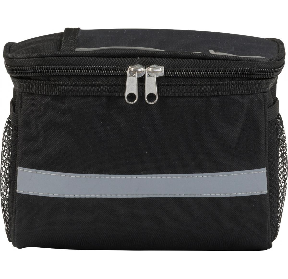 Bicycle cooler bag with two mesh side pockets, a reflective strip and a clear PVC pocket on top. 600D polyester material.