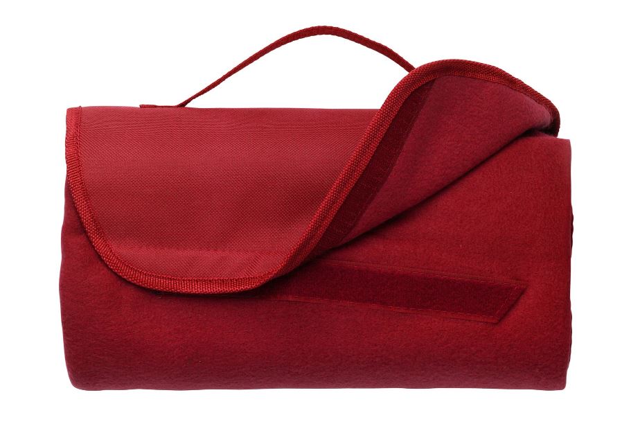 Fleece travel blanket with nylon carrying handle, unfolded size 133 x 120 cm.