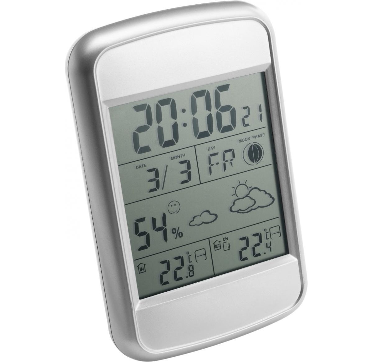 Plastic weather station with a sensor for using outside, clock, moon phase and weather forecast. Batteries included.