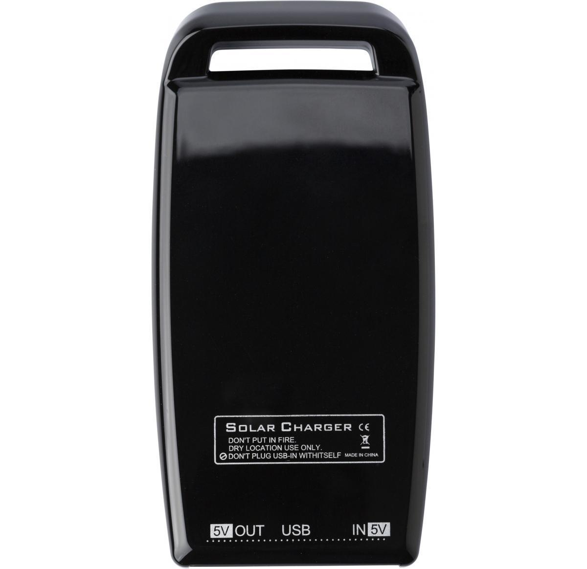 Plastic solar charger with 1000mAh, input 5v/500mAh, output 5v/500mAh-800m, a carry handle on top and three LED lights on the bottom, including a cable with different attachments.