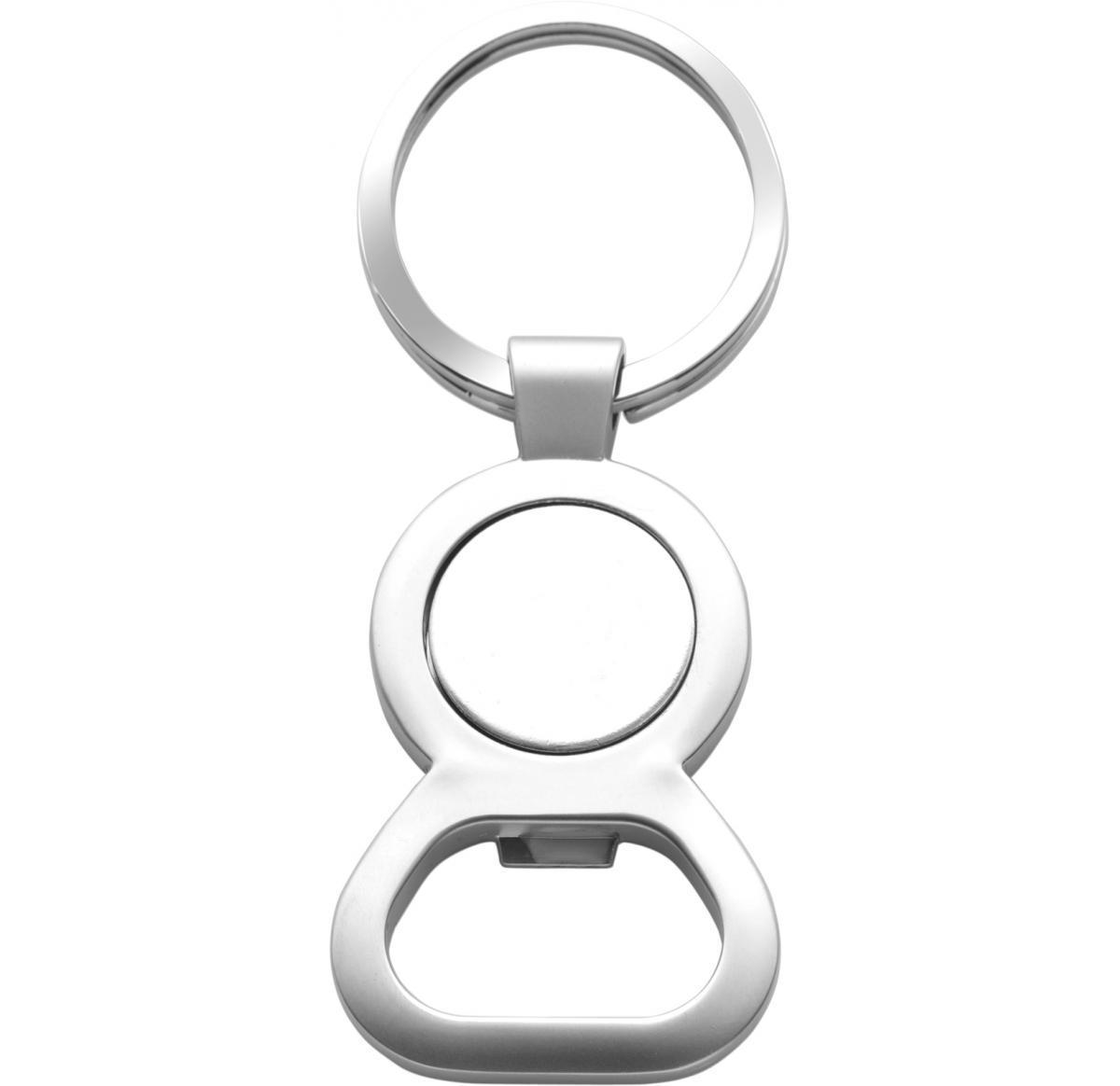 Metal key holder with a bottle opener and an inlaid magnetic 'euro' trolley disc, supplied in a black presentation box.