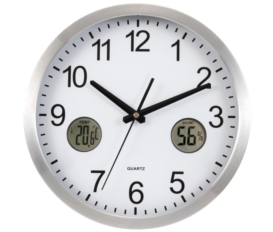 Plastic 30cm wall clock with a digital thermometer and hygrometer function.