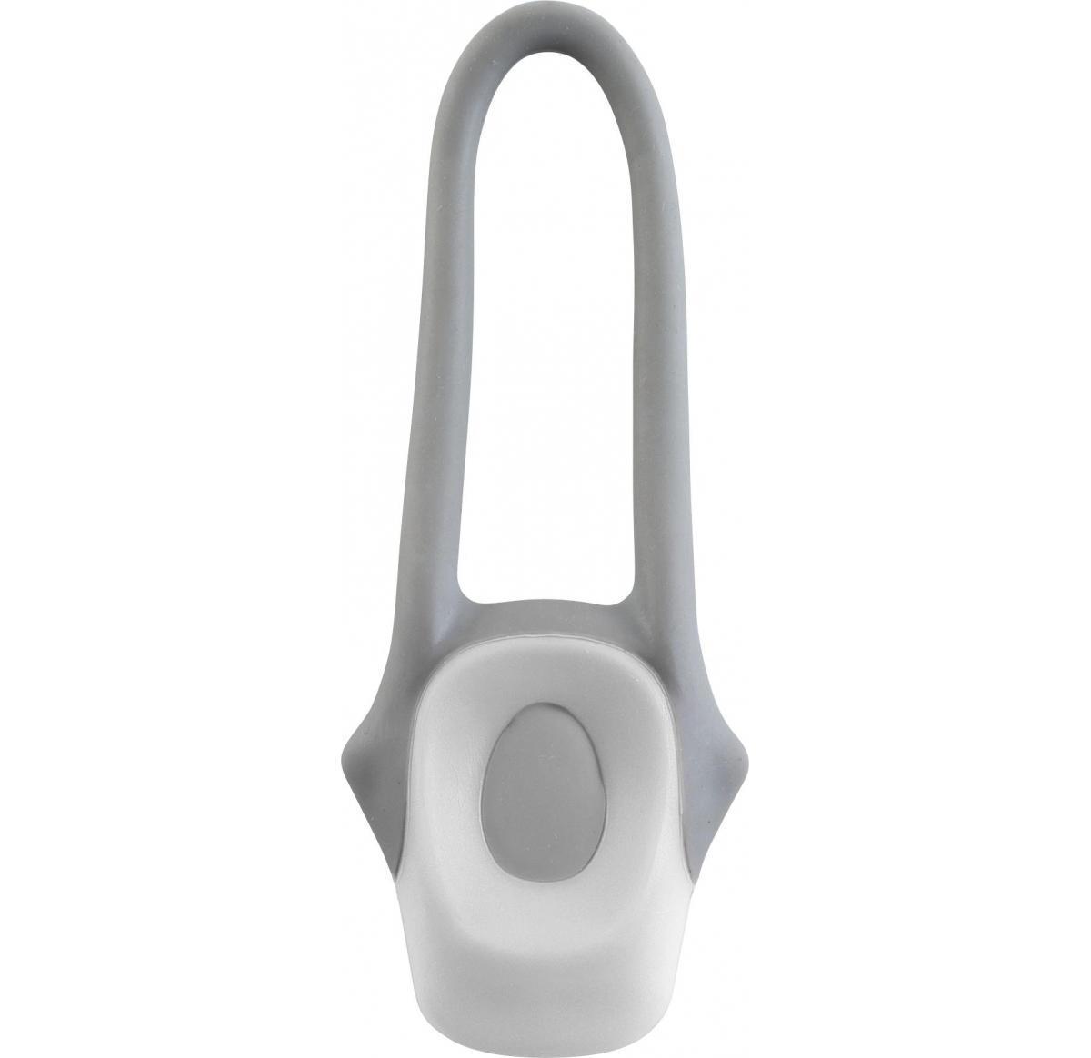 Plastic bicycle light with two LED lights which have two flashing options and a silicone strap.