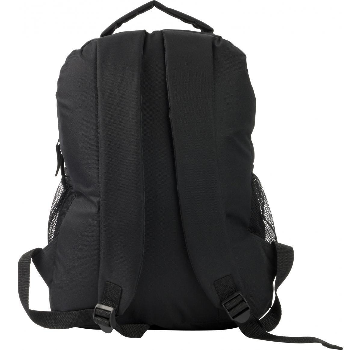 Backpack in a 600d polyester material with a main compartment, one zipped and one open front pocket, two mesh side pockets and adjustable shoulder straps.