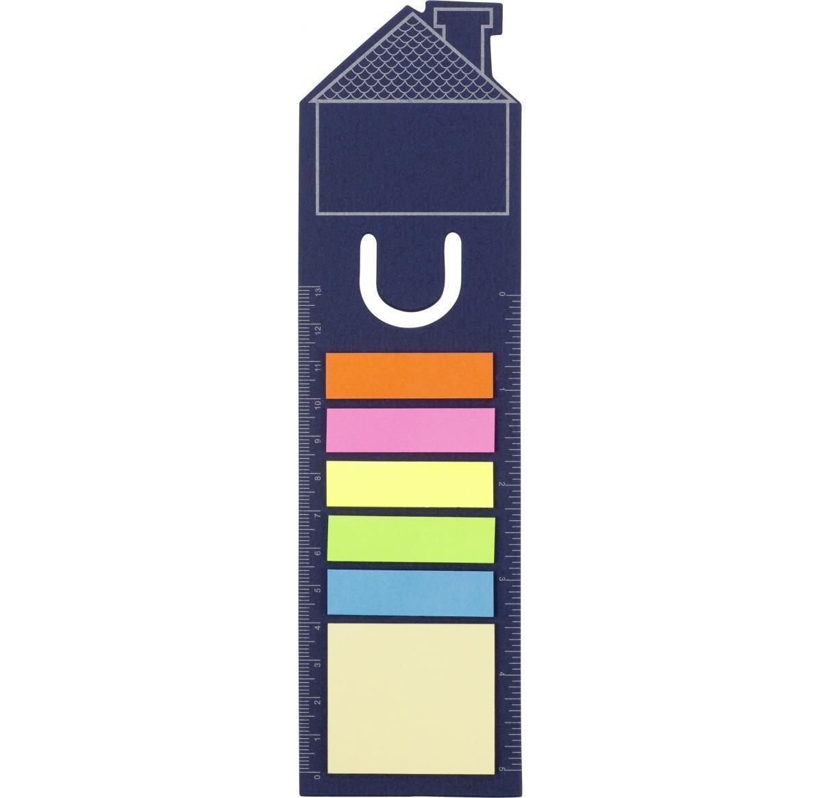 House shaped bookmark made from card with five different coloured sticky page memos, a 15 sheet sticky note pad, and a ruler.
