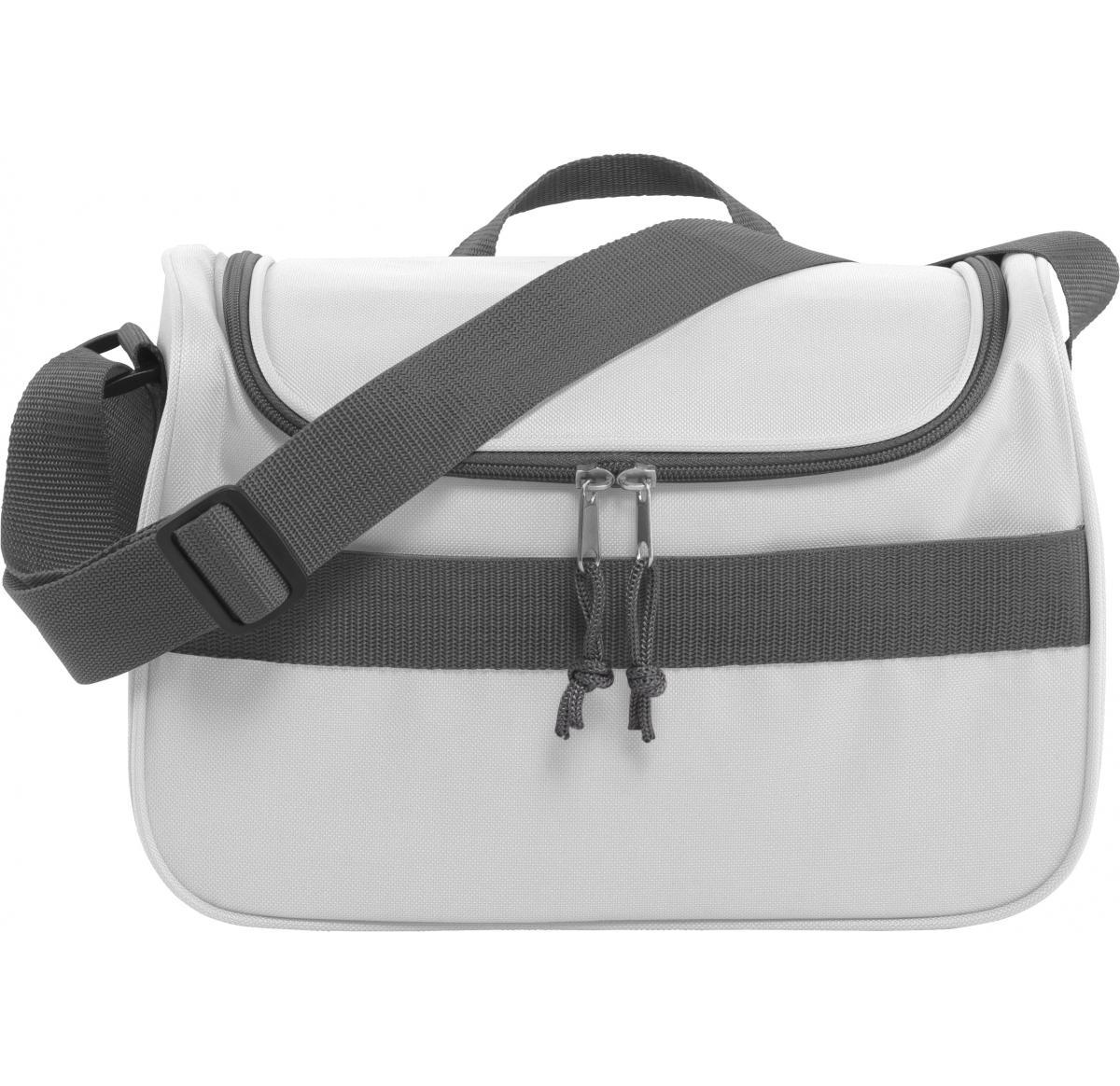 Polyester 600D cooler bag with a front pocket with Velcro closing, one large compartment, carry handle and adjustable carry strap.