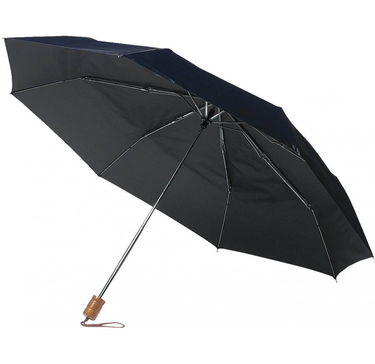Foldable 190t nylon fabric umbrella with a wooden shaft and supplied in a matching nylon sleeve with velcro closing.