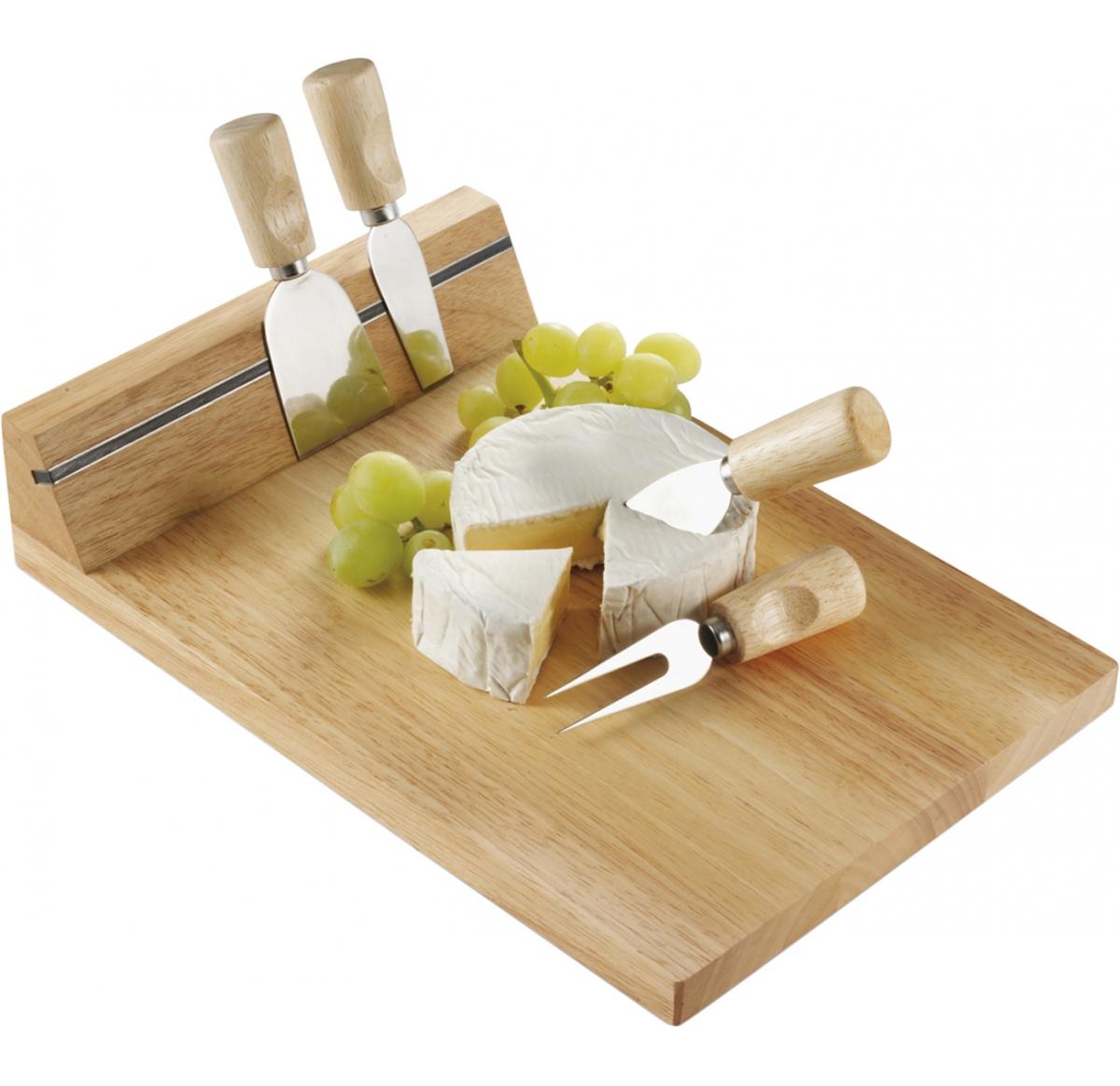 Wooden cheeseboard with magnetic tape strip and five accessories.
