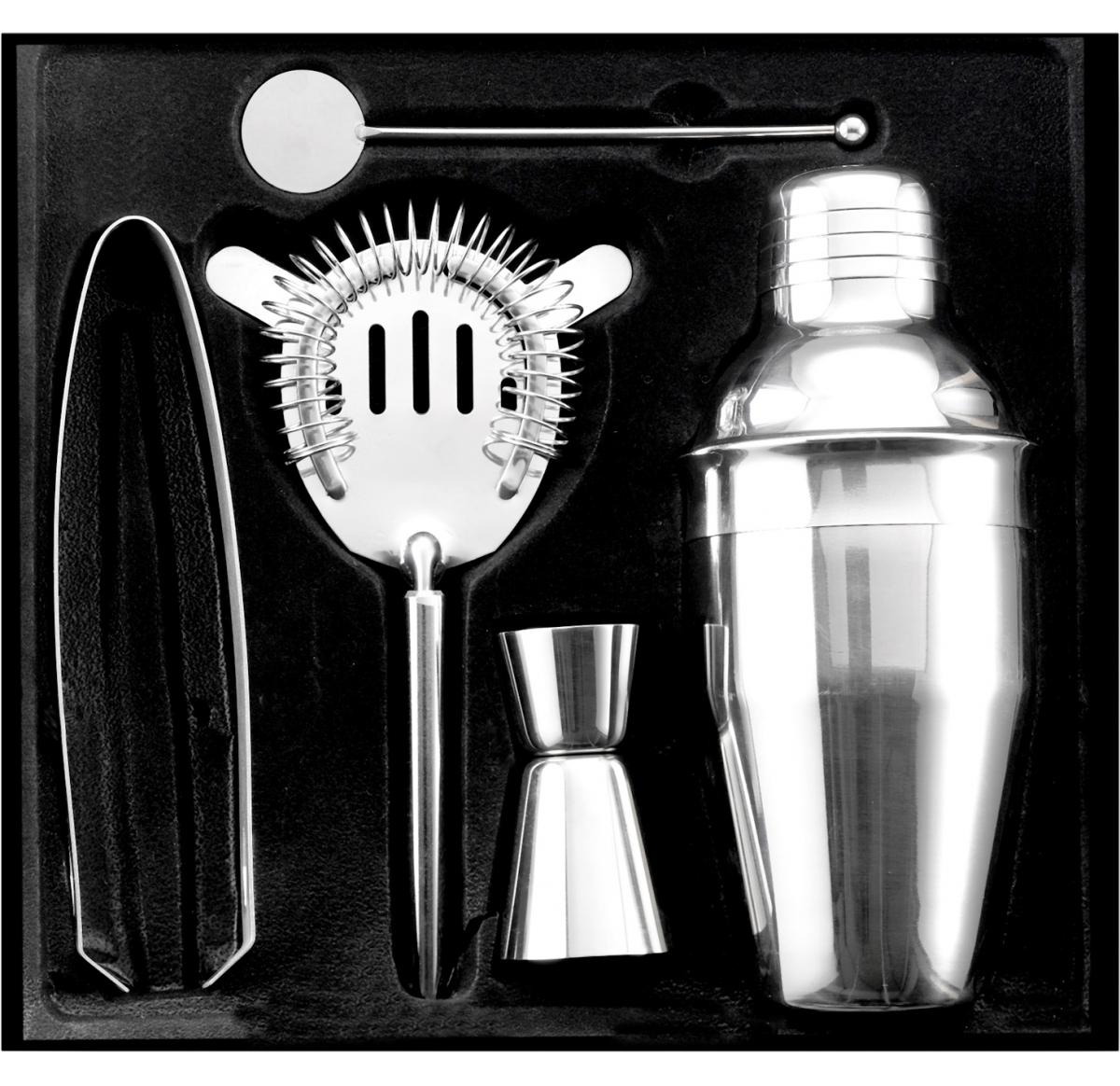 Stainless steel cocktail set with a 250ml shaker, including an ice tong and a spoon, supplied in a gift box.