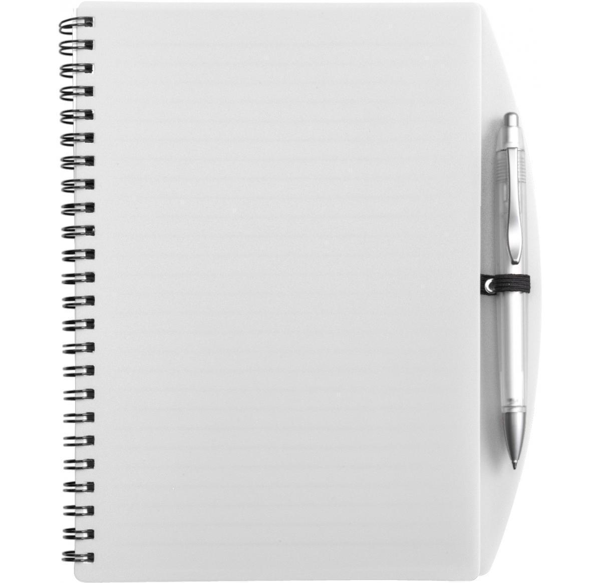 A5 Spiral bound PP covered sixty five page notebook and plastic ballpen with blue ink.