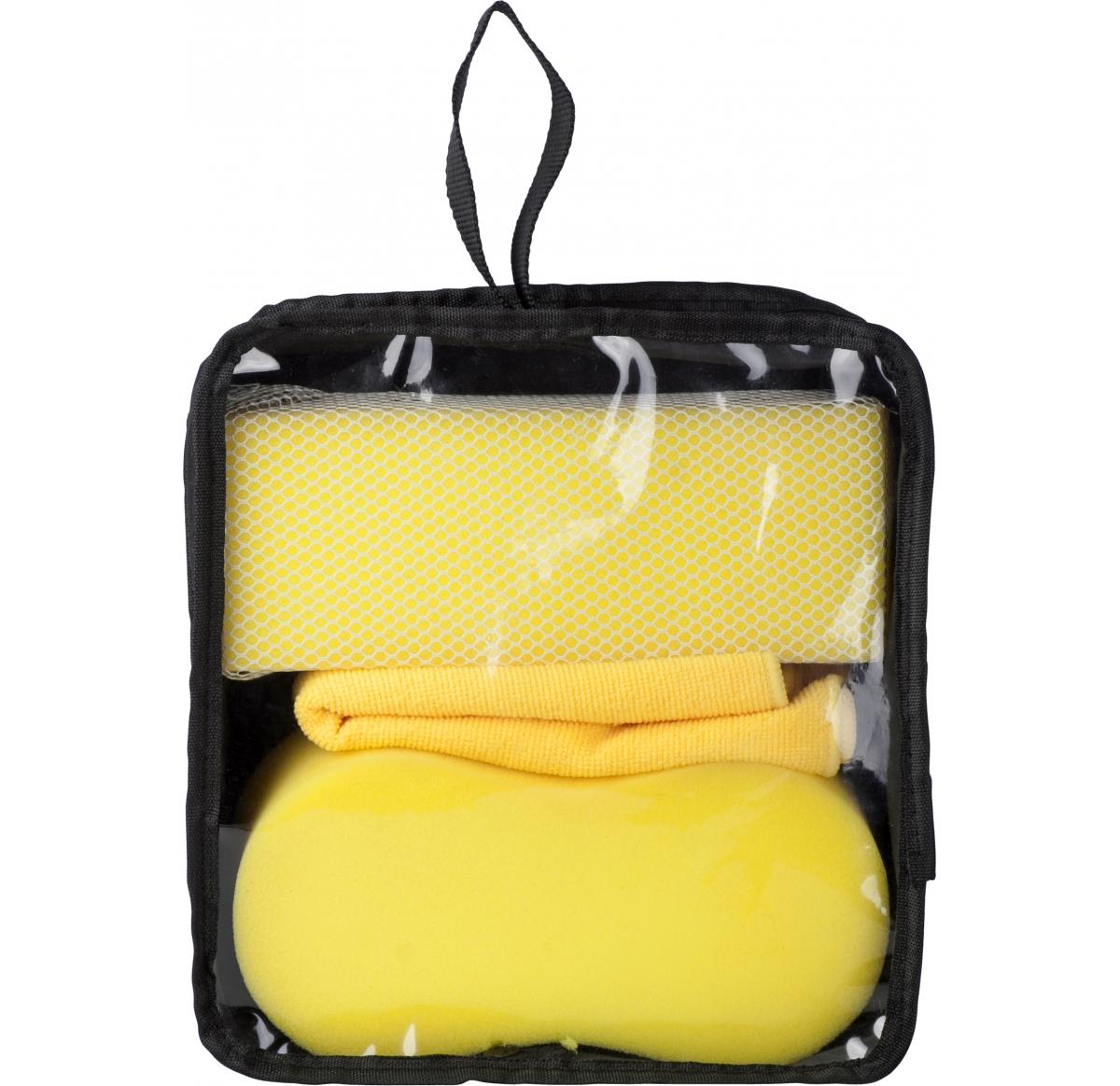 Three piece car wash set in a PVC case consisting of a sponge, a sponge with net covering and a microfibre towel.