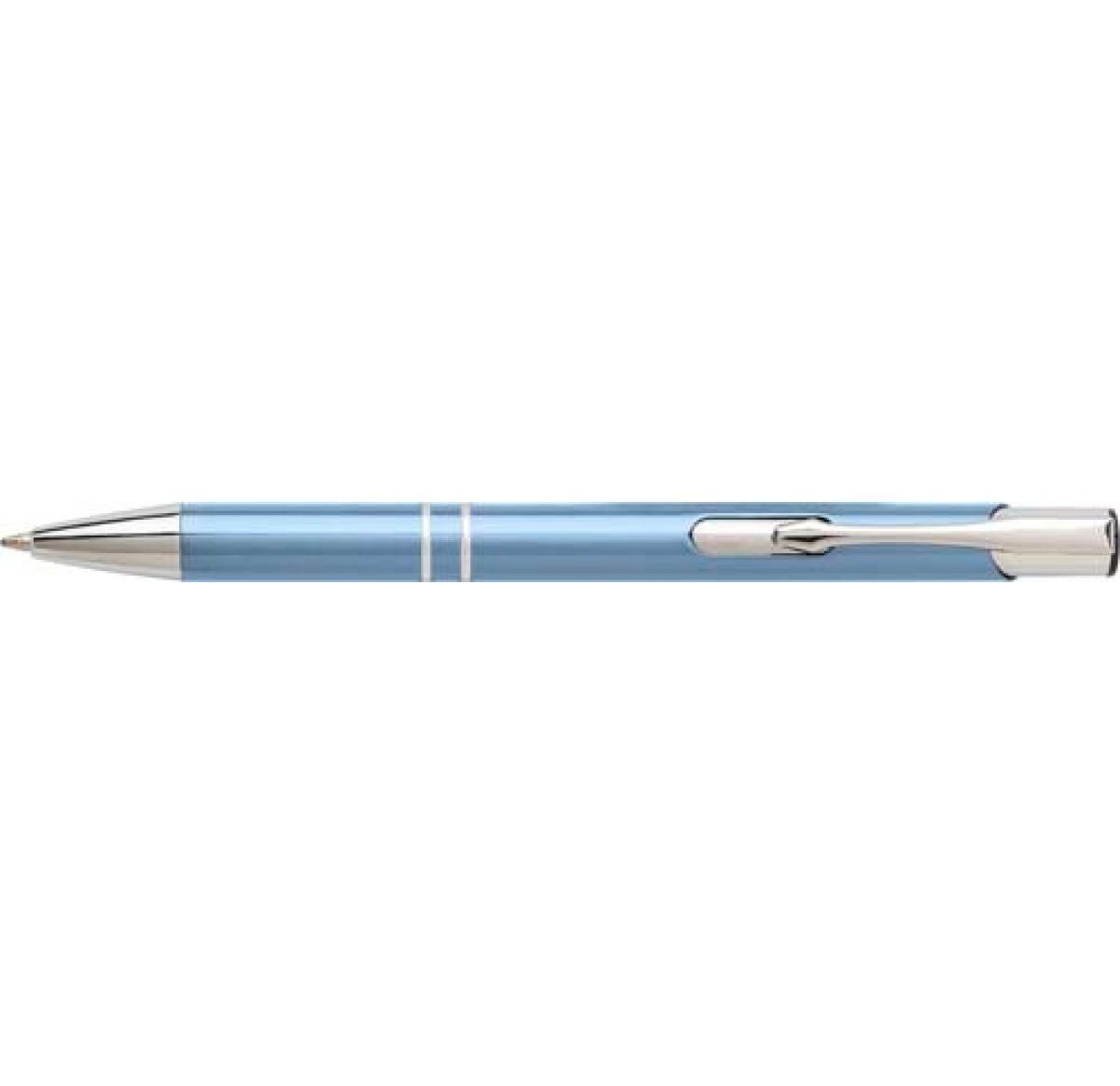 Aluminium ballpen with a UV coating, silver trim and blue ink.