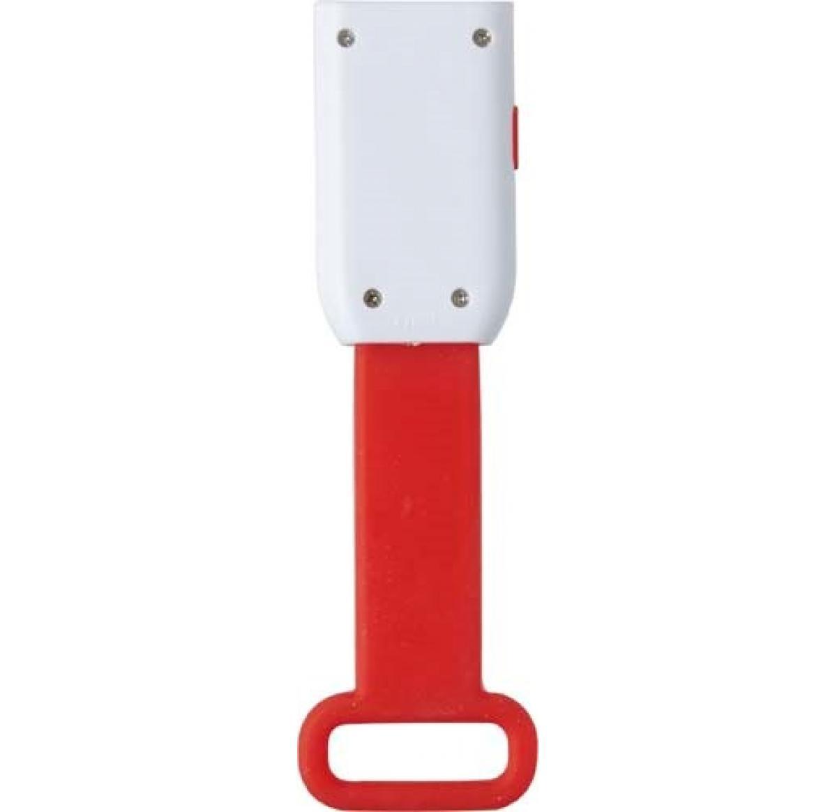 Plastic bicycle light with a silicon strap, 3 LED lights in the front and 1 LED light on the top.
