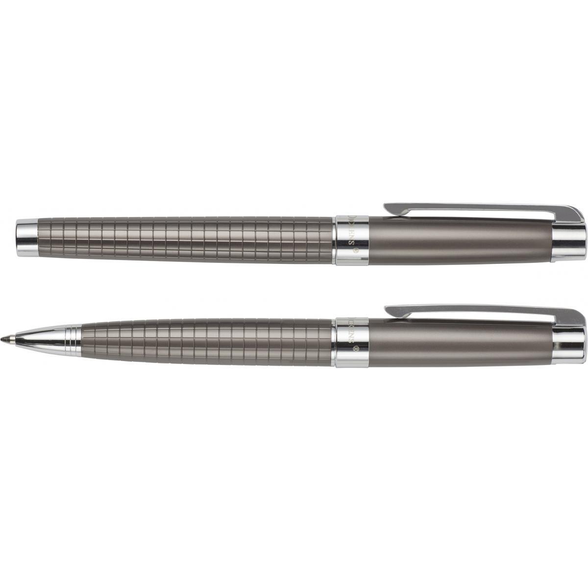 Charles Dickens pen set, consisting of a grey metallic ballpen and rollerpen both with black ink and presented in a luxurious dual fold box.