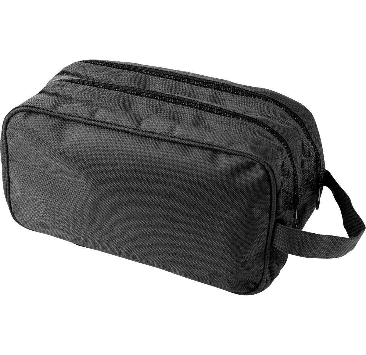 Toilet bag in a 600d polyester material with two zipped compartments.