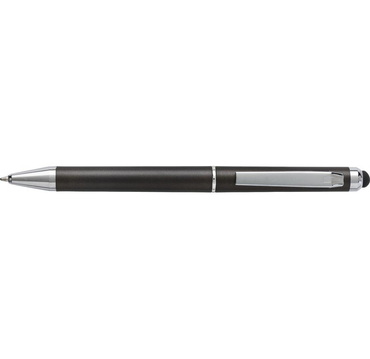 Plastic twist action ballpen with a rubber tip suitable for all capacitive screens, coloured body with silver trim parts, metal clip and blue ink.