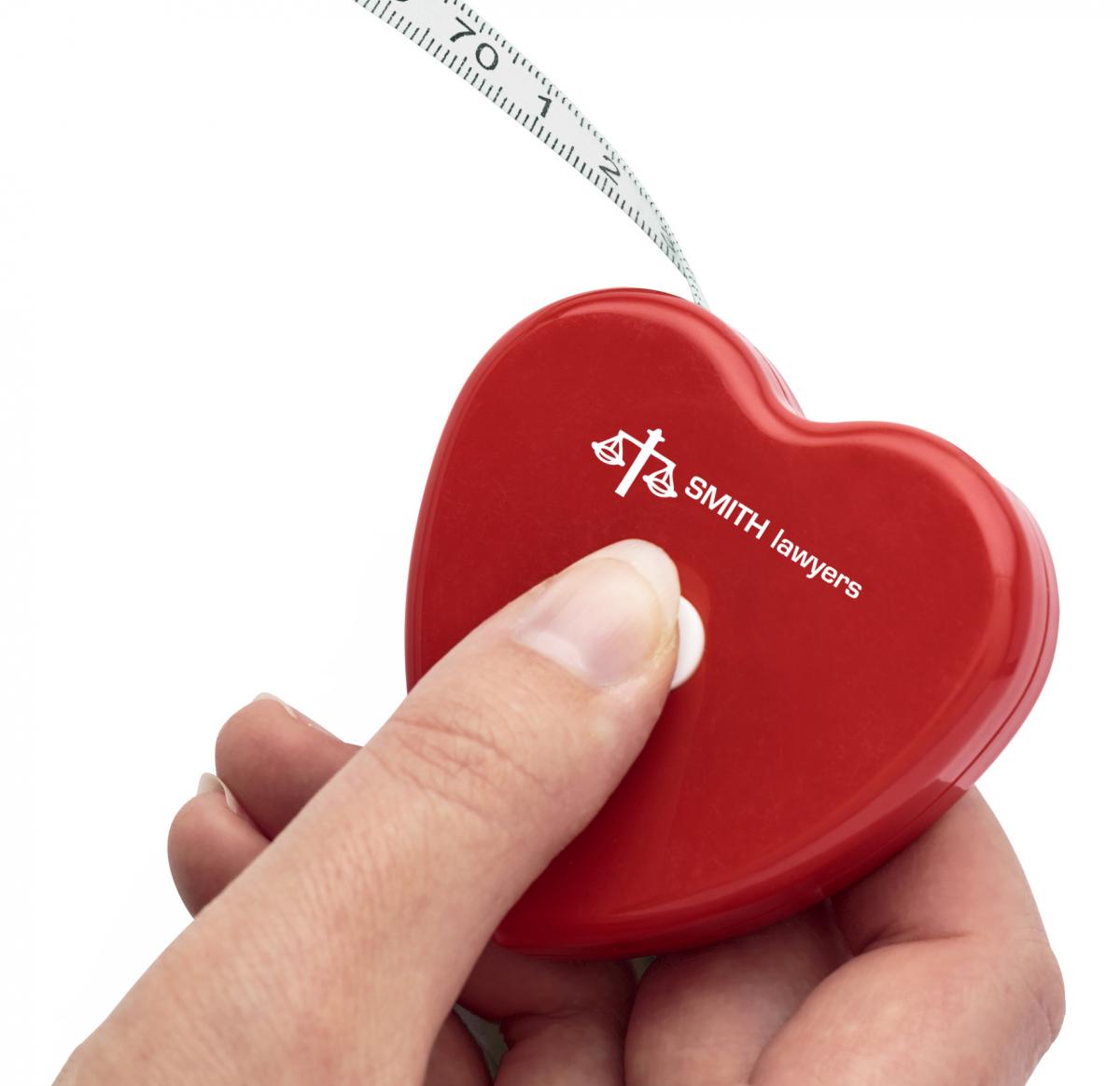 Plastic, 1.5m, heart shaped BMI tape measure, includes a weight (KG) and height (Mts.) indicator on the front. To be used for promotional purposes.