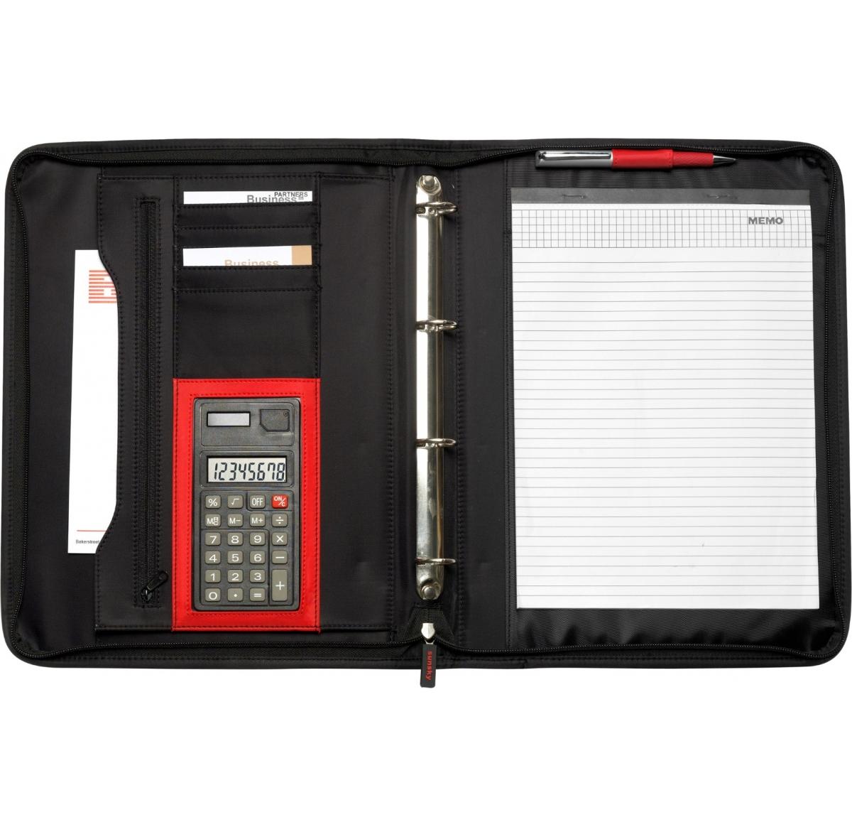 A4 Nylon zipped portfolio with a four ring binder mechanism, calculator and twenty page lined writing pad with a pen holder, the front of the bag has two zipped pockets while the inside has one zipped pocket and slots for five credit cards.