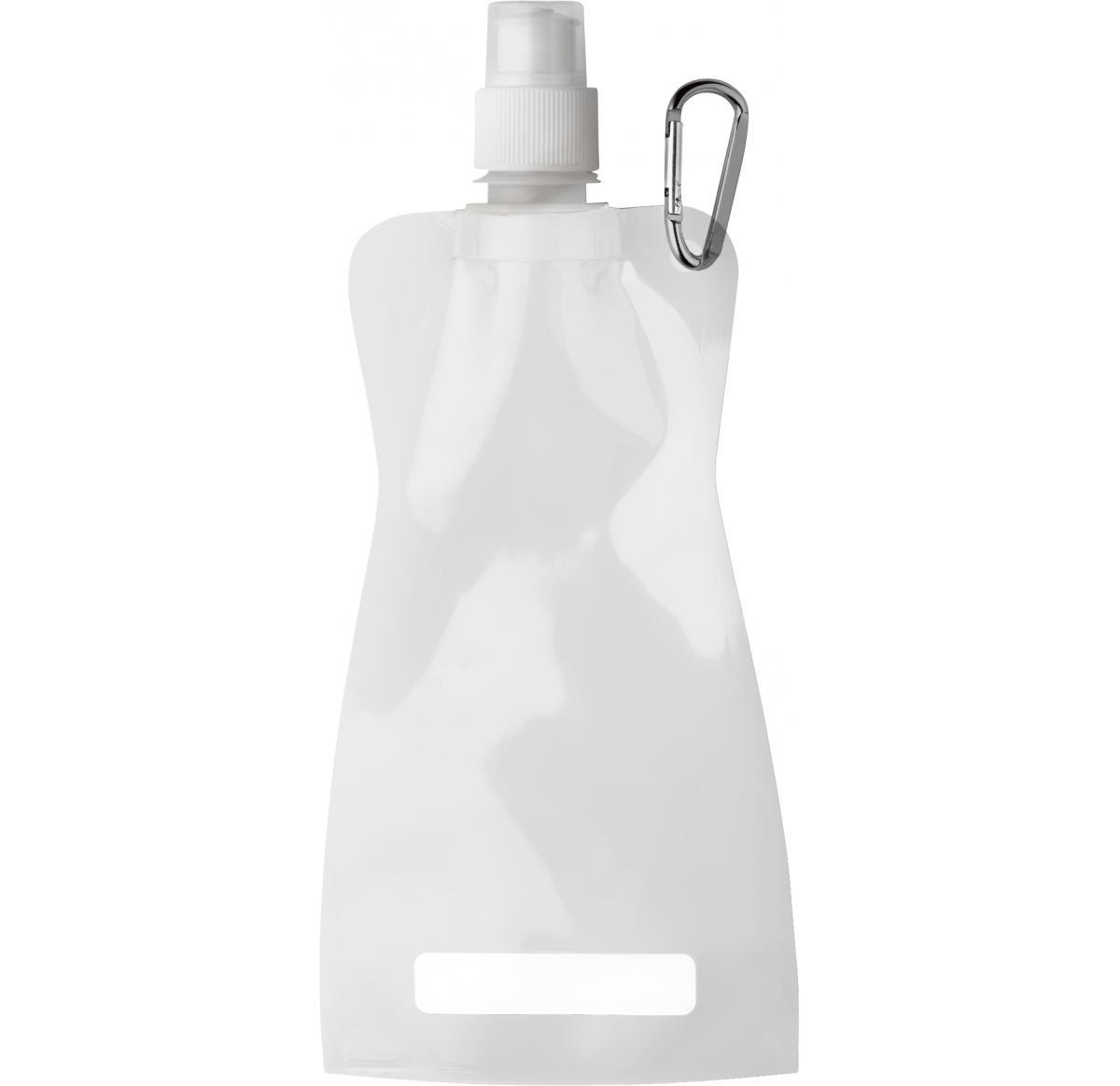 Foldable transparent plastic water bottle with belt clip, 420 ml capacity.