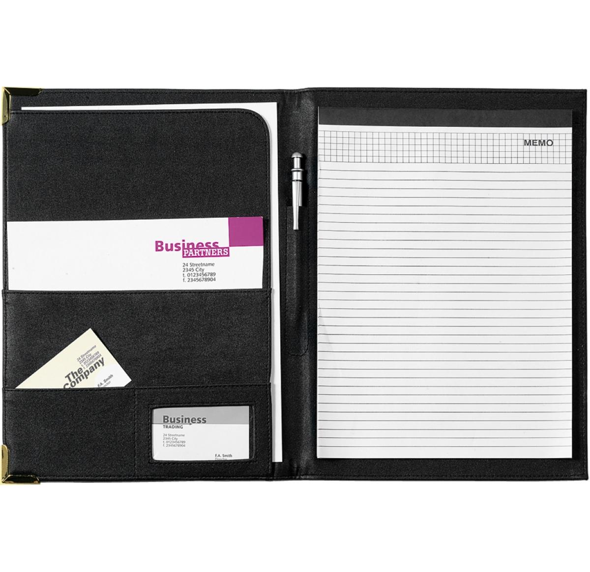 A4 Conference folder in a PU material, note pad (item code 8400) & pens not included, colours: blue/silver gilt corners, black/gold gilt corners.