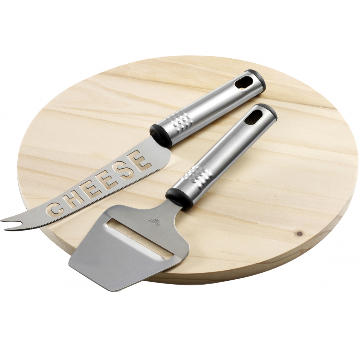 Wooden cheese board with a metal cheese knife and a slicer.